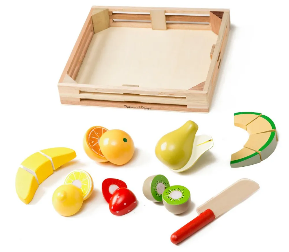 Legemad er populært hos børn. Her finder du en flot trækasse med lækre frugter og en kniv til at dele frugterne med.