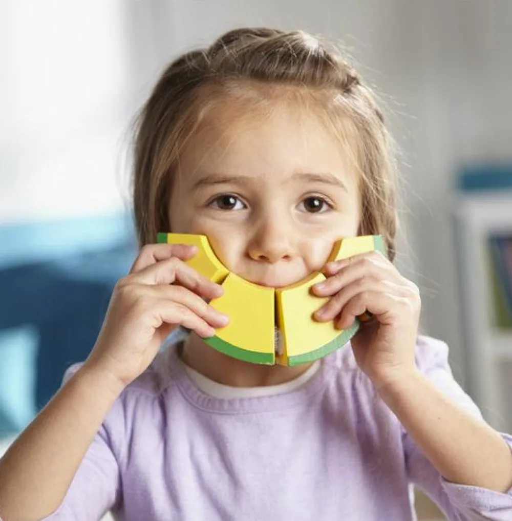 Frugten og grøntsagerne er delt over, og sat sammen med velcro, så de er nemme at “skære” over, og sætte sammen igen.