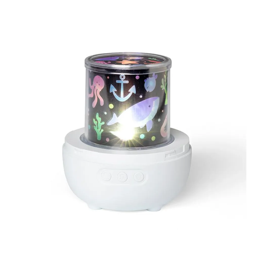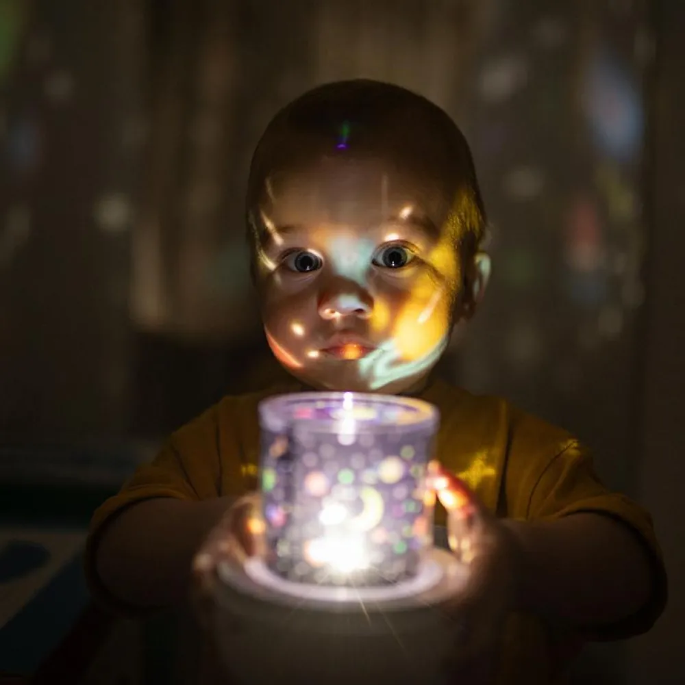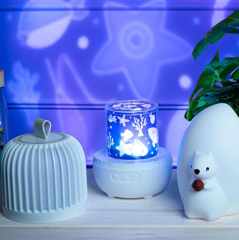 Denne projektor skaber en tryg og fortryllende stemning på børneværelset eller i stuen. Den kan lyse i gult, blåt og hvidt.
