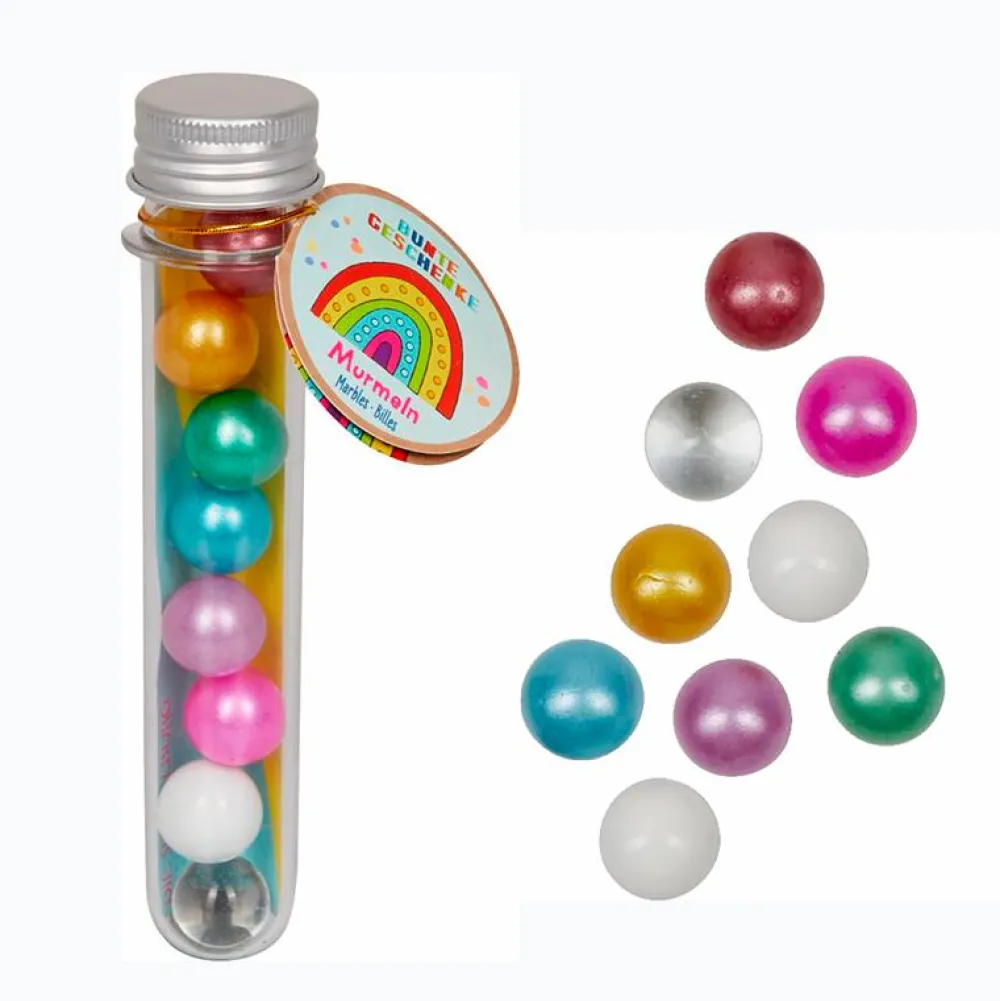 Glaskugler har fascineret børn i generationer. Her er 9 fine glaskugler som er inspireret af regnbuens farver og som dit barn kan trille med, lege med og nulre i lommen, når de ikke ligger i det praktiske rør.