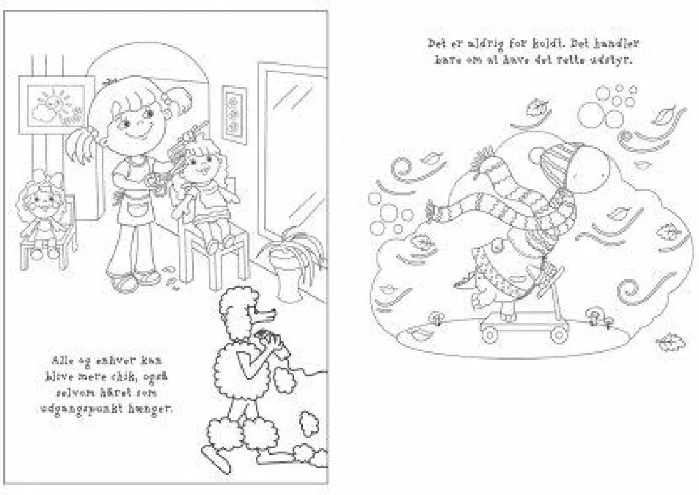 Billederne kan farvelægges med tusser eller med farveblyanter.