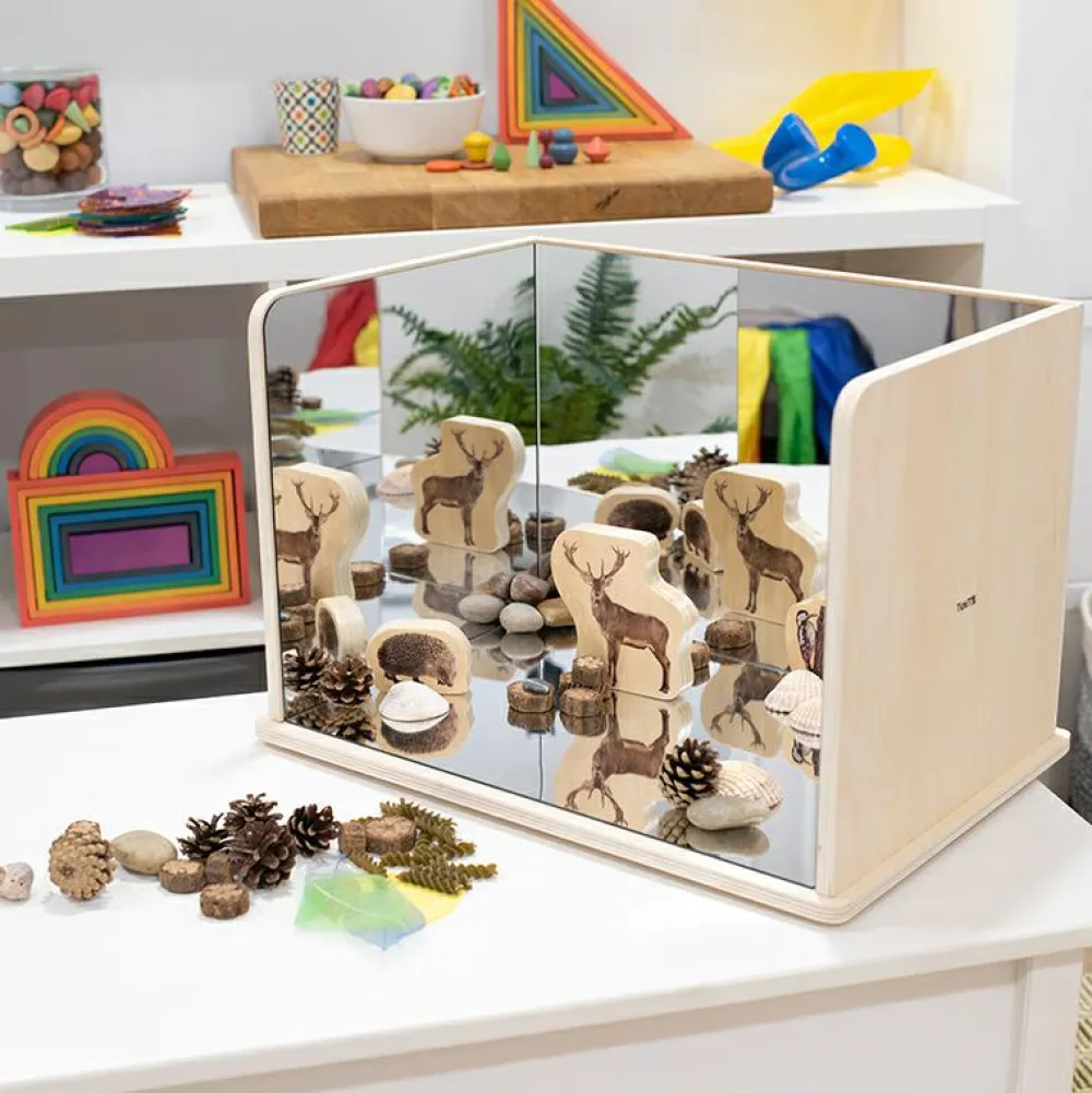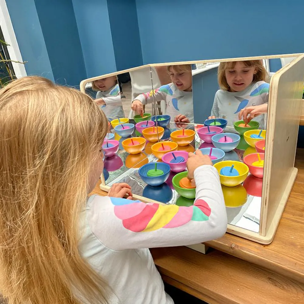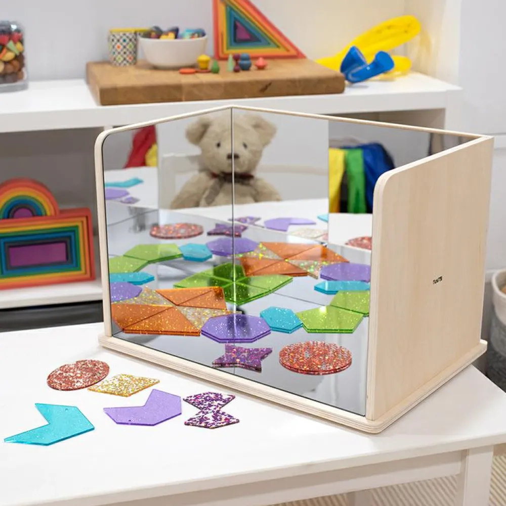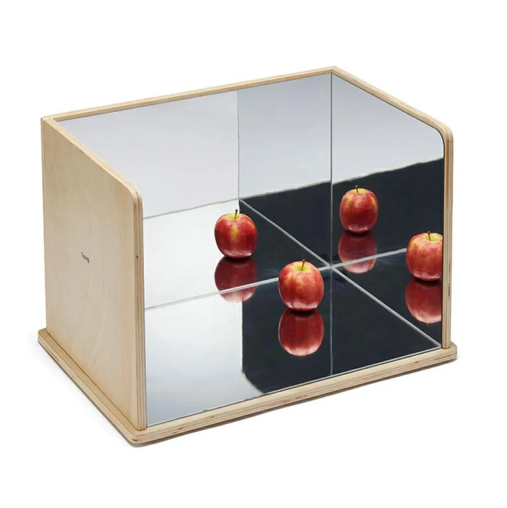 Når dit barns hjerne oplever noget, der sprænger rammerne, så kaldes udforskningslysten frem. Der skal tænkes nye tanker, når fx et æble eller en hjemmesko stilles i dette fine spejl. Der opstår uendelige spejlinger, som får dit barn til at undre sig.