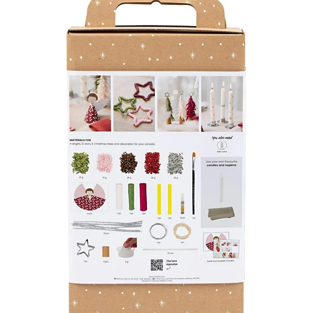 Lav seks små engle af karton, juletræer af crepepapir og pyntede stjerner, som kan bruges som servietringe. Der følger også lysvoks med, som du kan bruge til at pynte stearinlys, hvis du har nogle af slagsen liggende et sted.