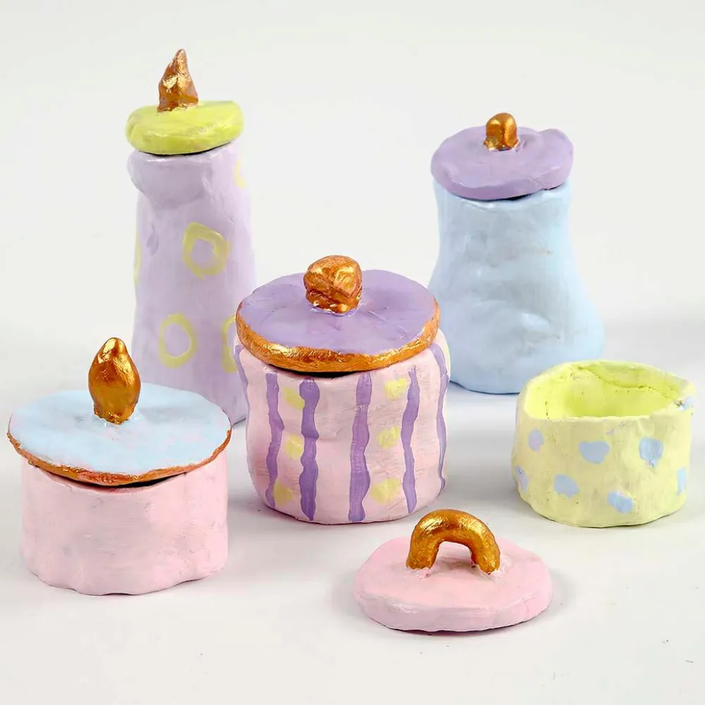 I kan lave fine krukker med låg, som I derefter maler. Der kræves ingen ovn, leret er nemlig selvhærdende og nemt at modellere med.