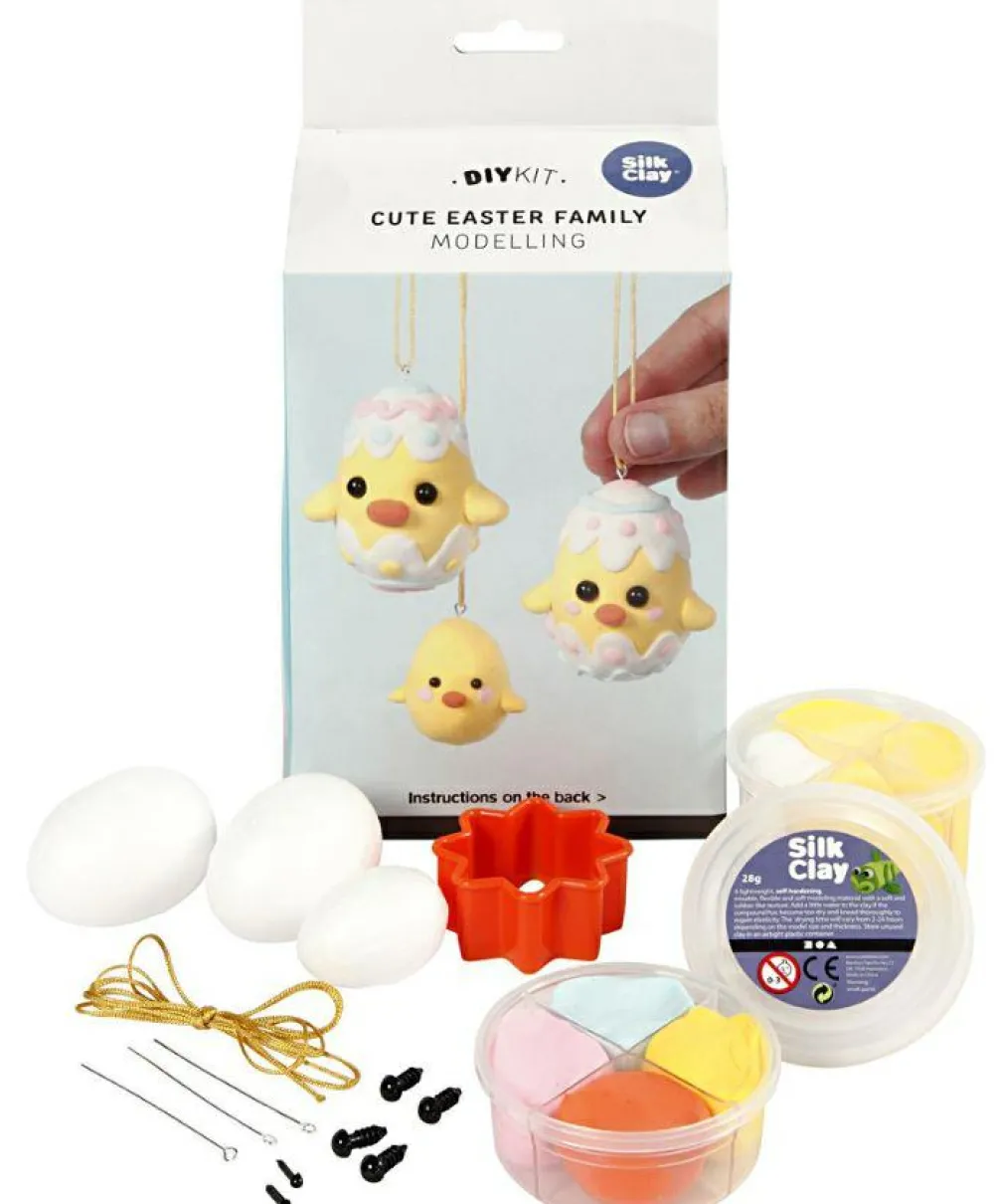 Indhold: 6 farver Silk Clay, 3 æg af styropor, 1 udstiksform, 3 sæt øjne af plast, 3 perlestave og snor til ophæng