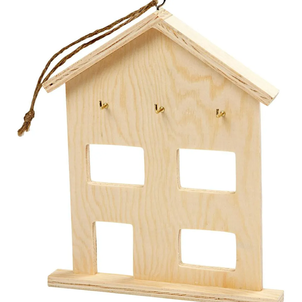 Her er et nøglehus i krydsfiner. Det kan dit barn male med akrylmaling, så det bliver ekstra flot, og kan hænges op i gangen.