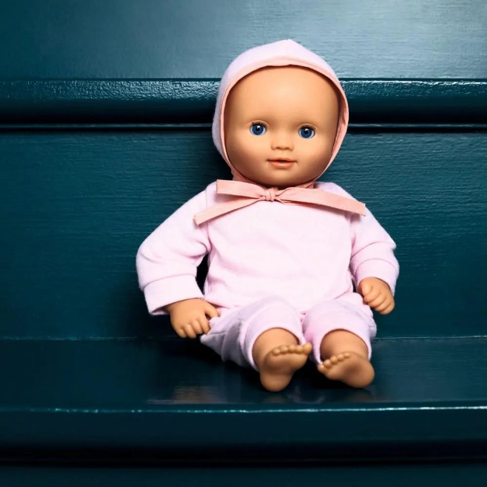 Dukke er frisk på en tur i vaskemaskine, hvis den bliver beskidt. Den skal bare nøjes med skåneprogram. Ikke noget med en hård gang centrifugering, ellers tak. Tøjet tåler almindeligt vaskeprogram og 30 grader.