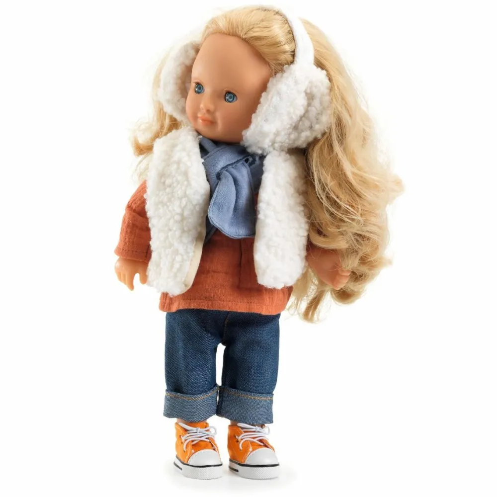 Har dit barn en dukke på omkring de28-34 cm, er dette lune sætmed vest af imiteret lammeuld, matchende ørevarmer og tørklæde af bomuld lige sagen.