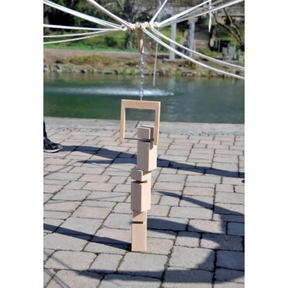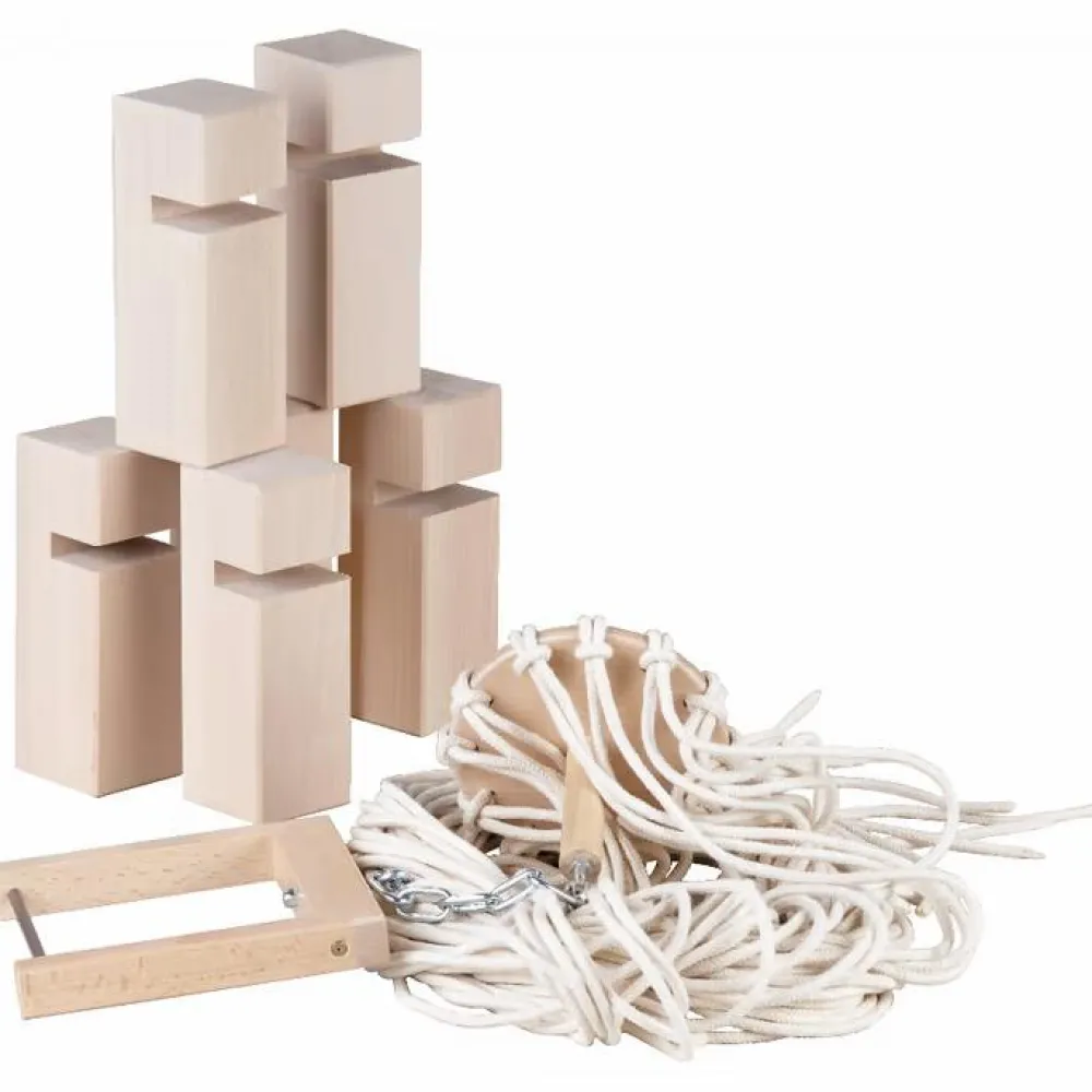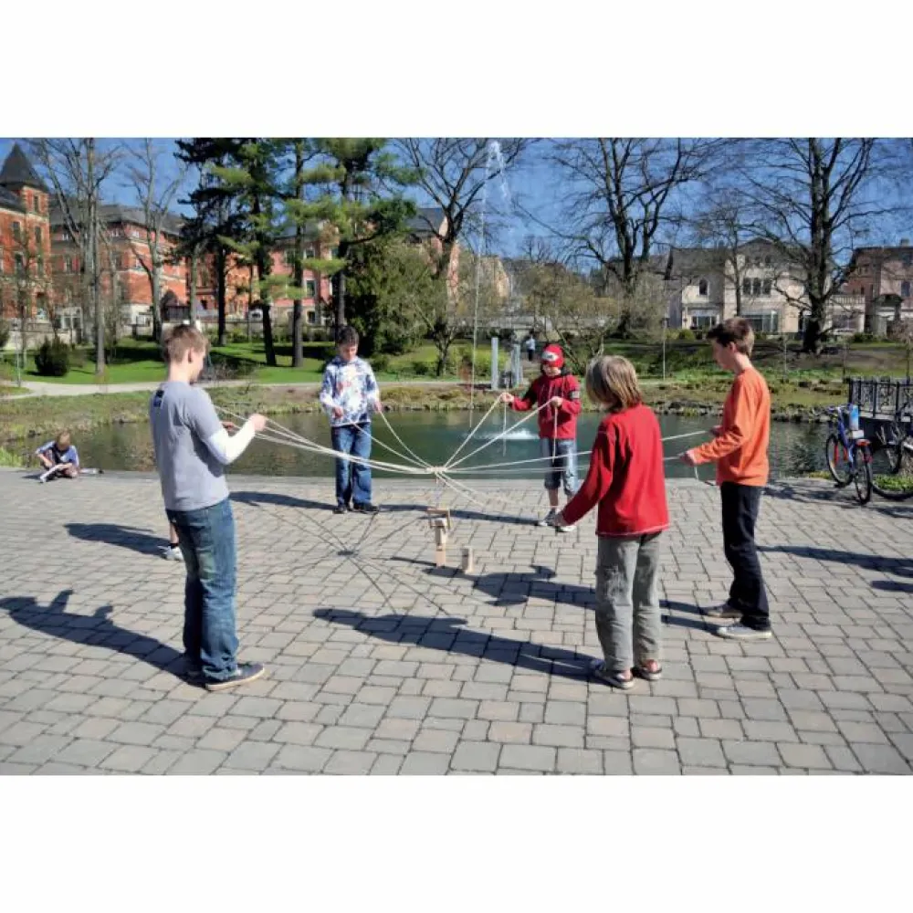 Hold fast i de 24 snore (en snor pr deltager eller flere snore til hver deltager), og prøv at styre “gribe-klodsen”, så den får fat i hakket i en af de andre klodser.