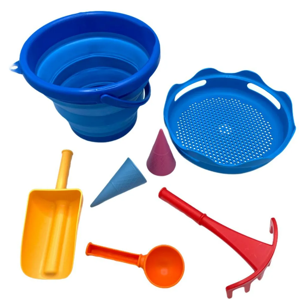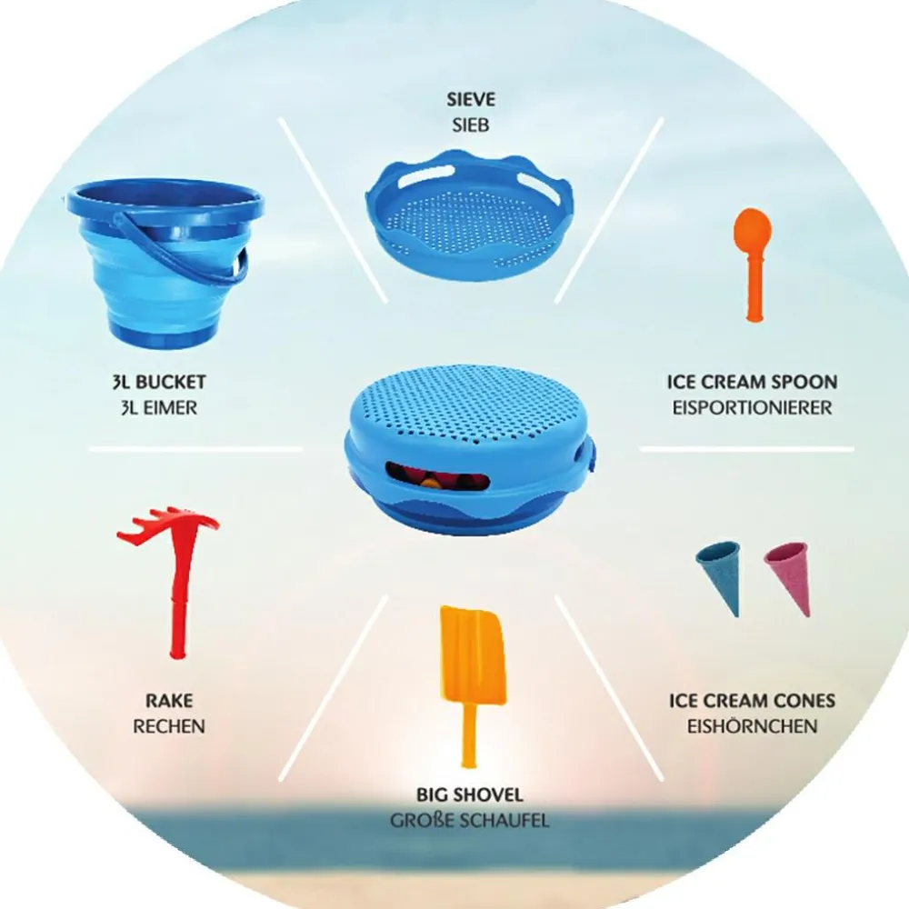 Skønt sæt til med alt til en tur på stranden eller ned til nærmeste sandkasse for at grave, sigte, rive og bygge sandslotte og flotte is.