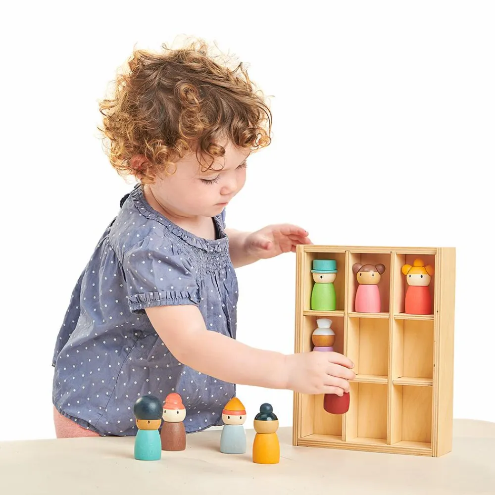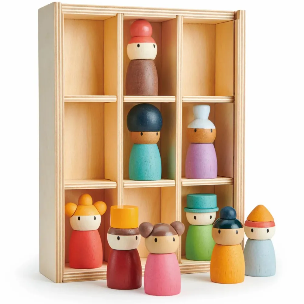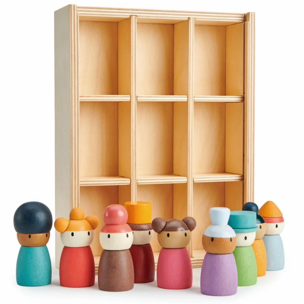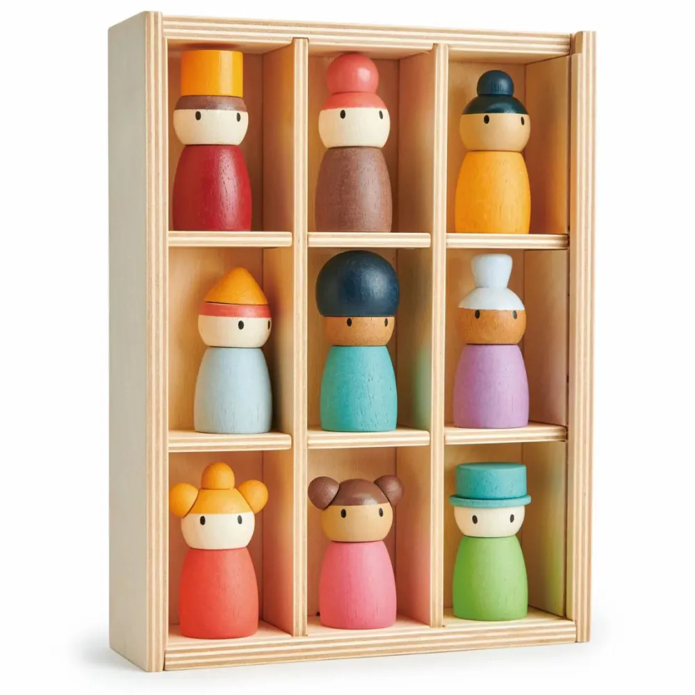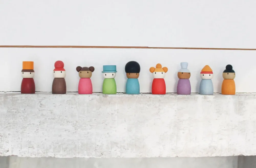 De 9 figurer i FSC-mærket træ har hver deres udtryk med forskellige hatte og frisurer, som dit barn kan bruge i sin rolleleg.