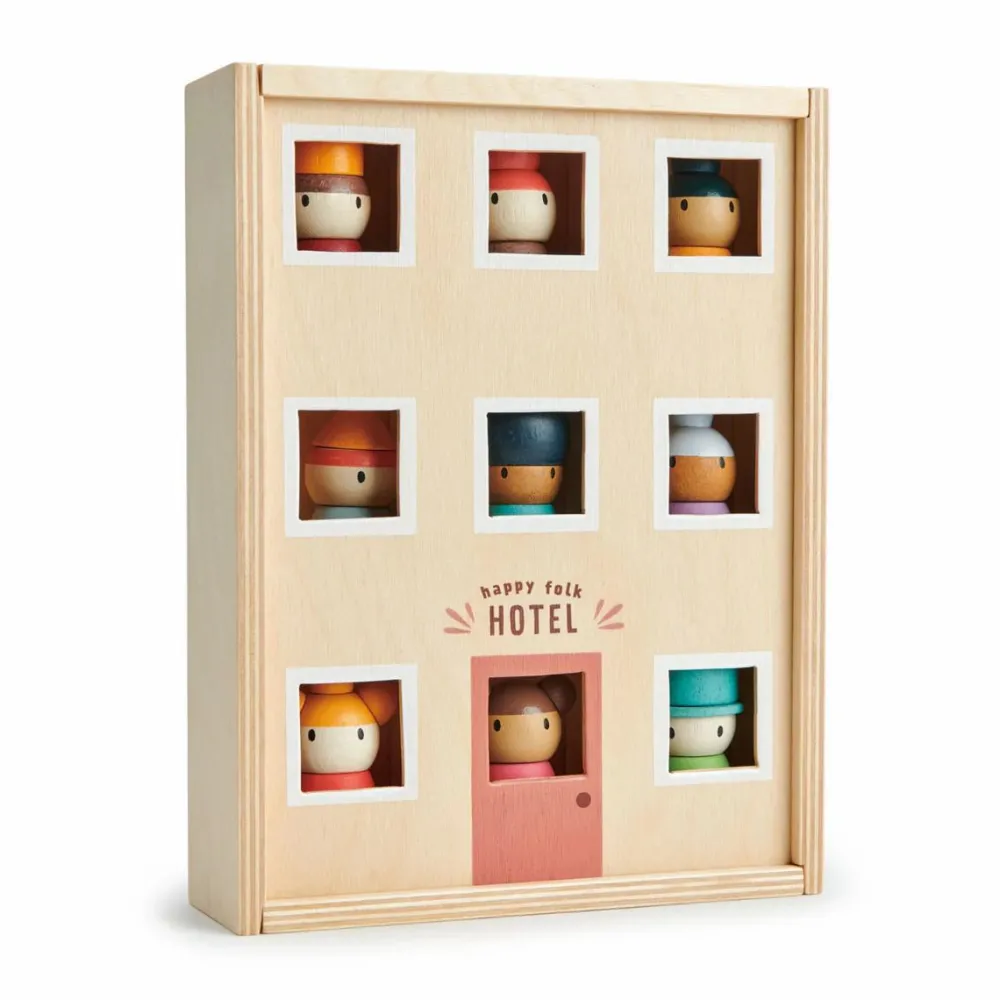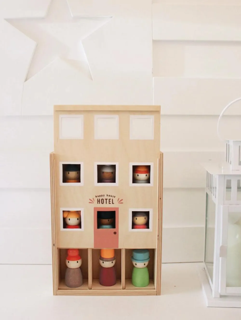 Figurer i æsken kan kigge ud af vinduerne, når dit barn lader hotellets frontfacade glide på plads. Mon alle er “hjemme”, hvor de på skift kan besøgerhinanden mellem etagerne. Måske er nogle stykker – eller hele bundtet – ude på tur.