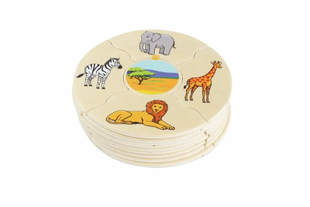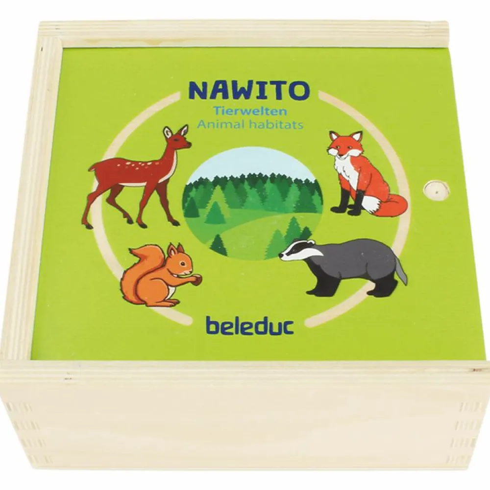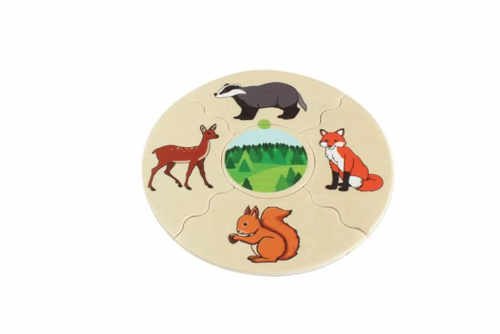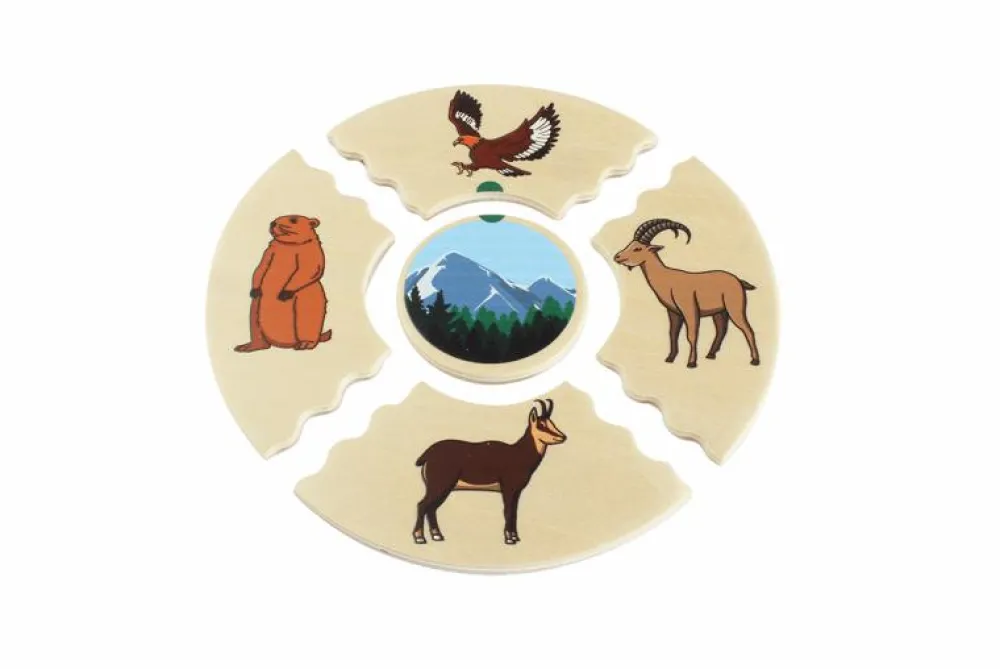 I denne fine æske af træ gemmer der sig 9 puslespil med 5 dele. Hvert puslespils midterbrik er et habitat, altså et særligt miljø af dyr og planter. Så er det op til jer at finde ud af, hvilke 4 dyr, der bor i netop dette habitat.