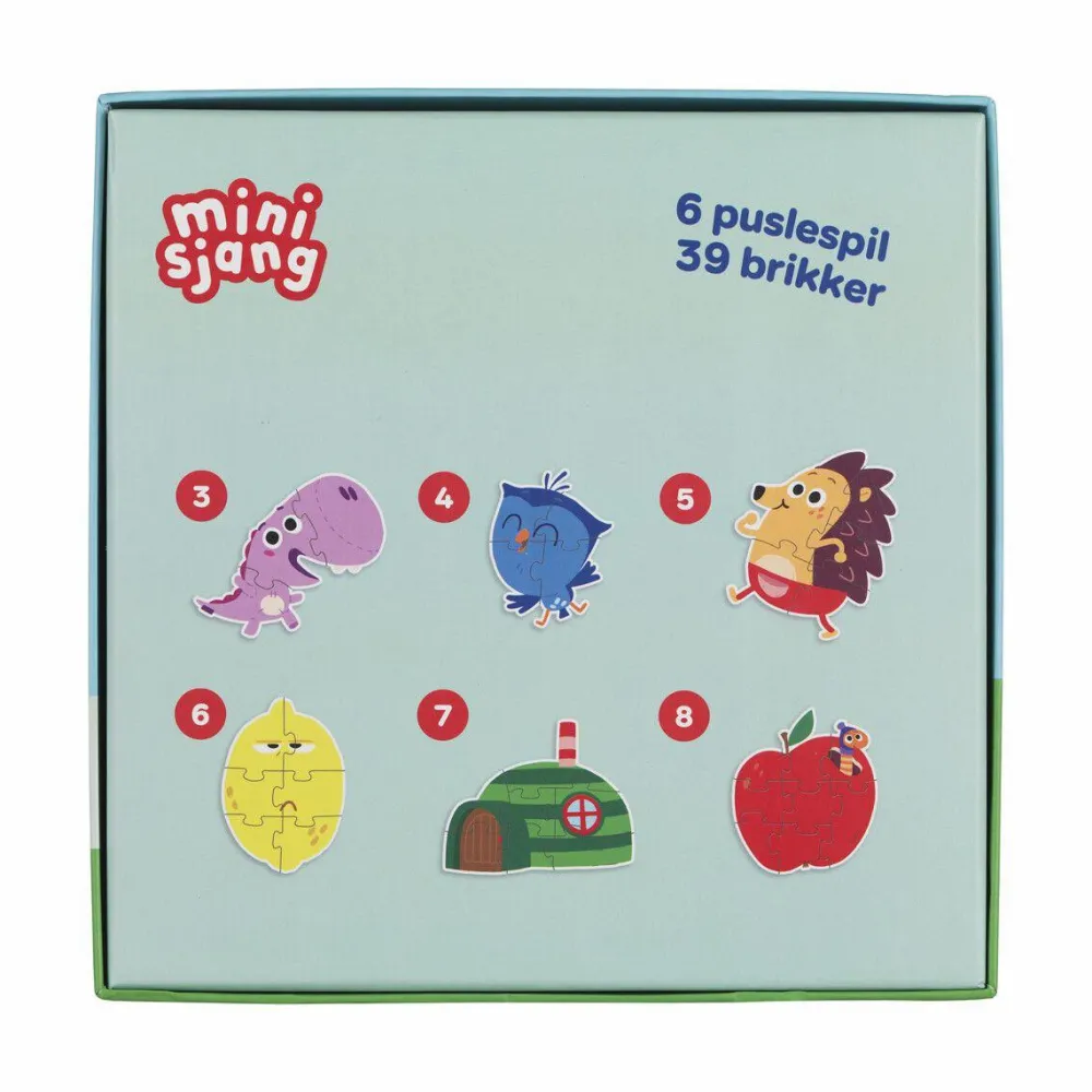 6 små puslepil med 3-8 brikker, så der er lidt forskellige sværhedsgrader. Alle med Minisjang-maskotten Børste og hans venner.