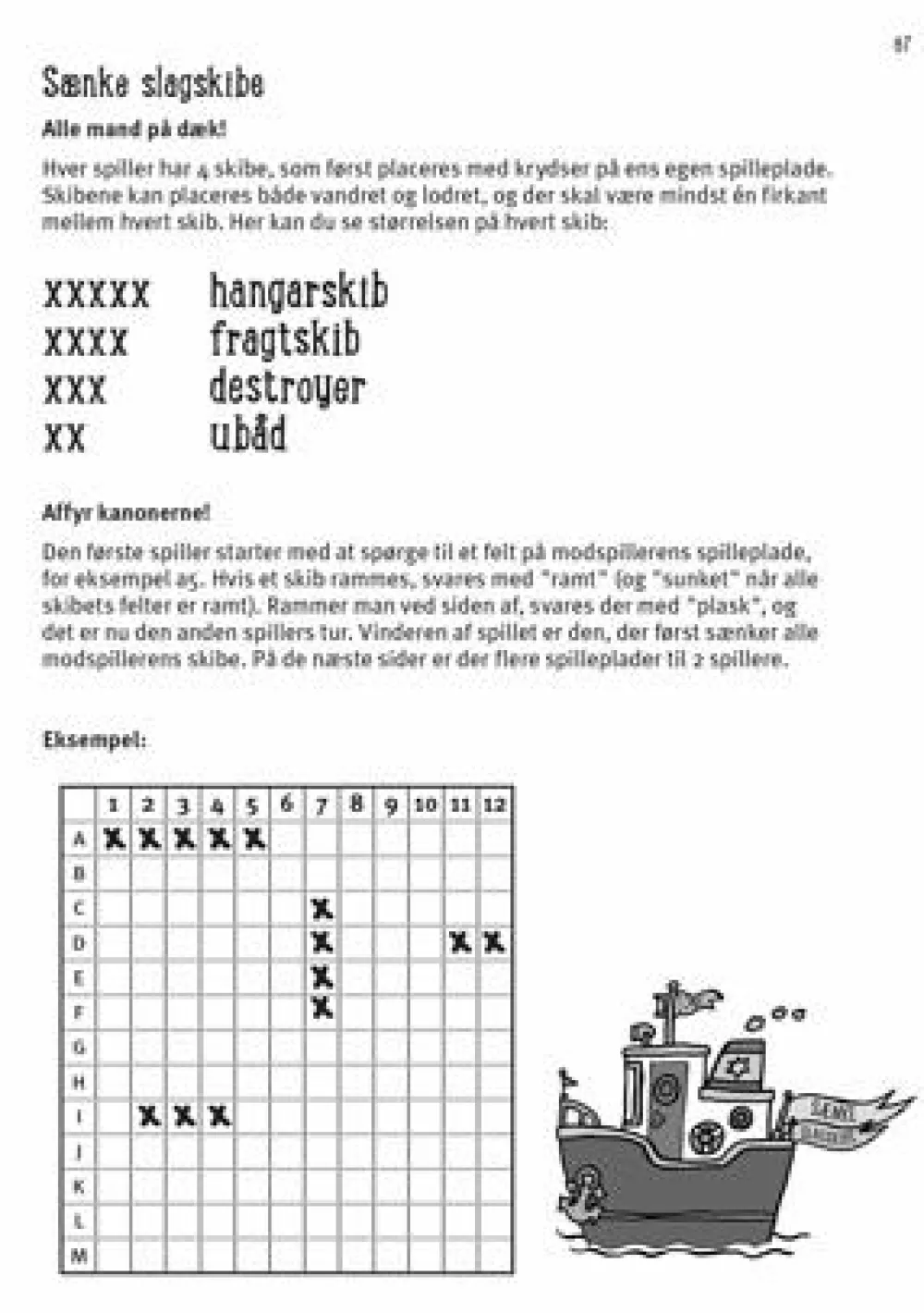 Bogen har bagerst aktiviteter til to personer, som fx kan prøve at sænke slagskibe, mens regnen trommer på vinduet eller der skal fordrive tid i toget eller på bagsædet i bilen.