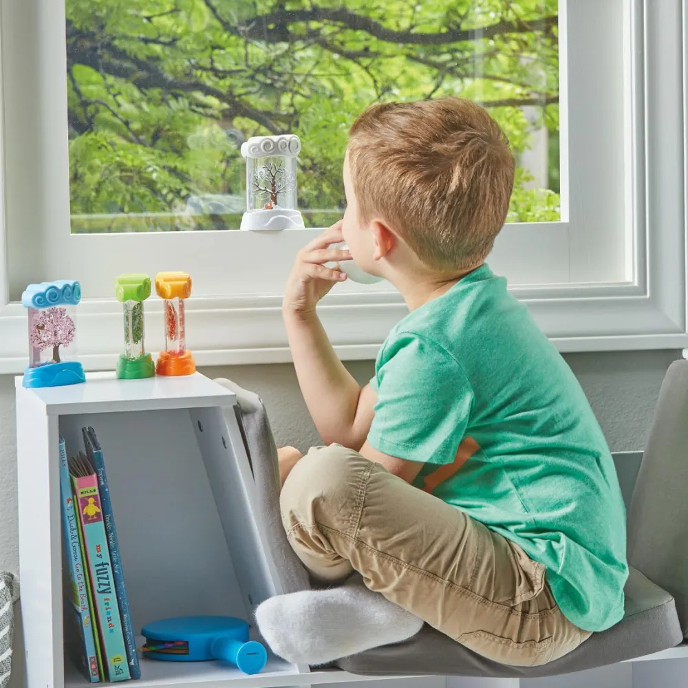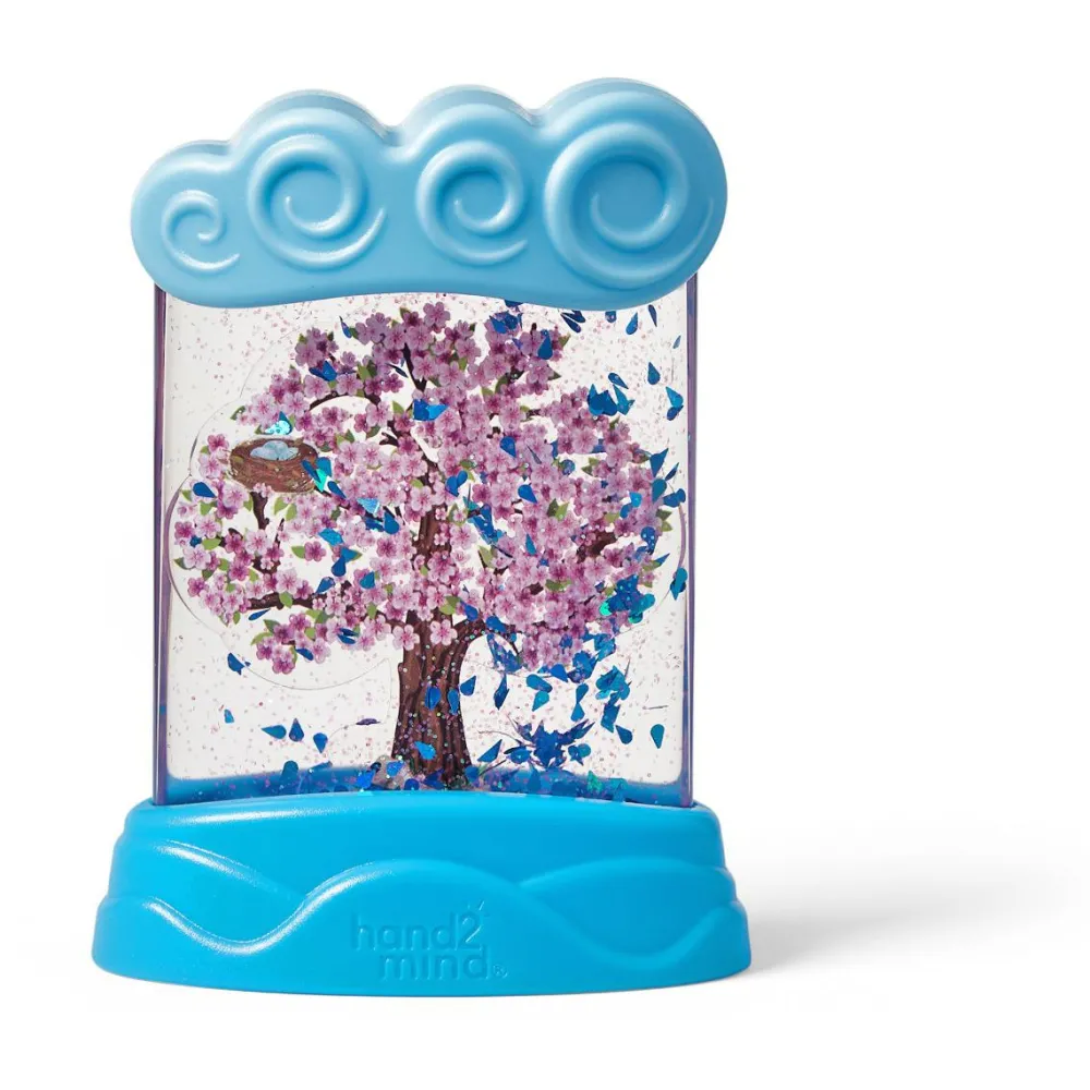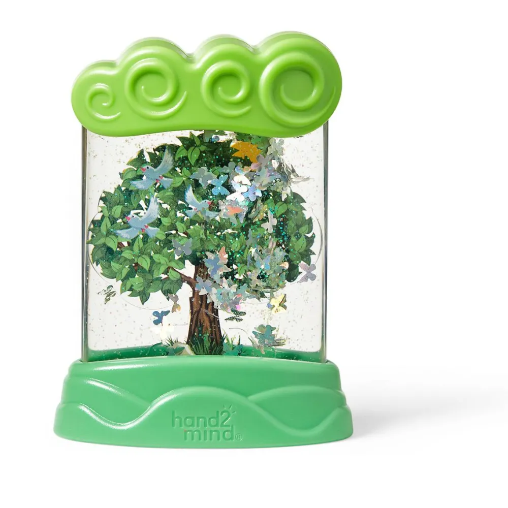 Ligesom en snekugle kan I ryste de fire rør og se bl.a. regndråber, sommerfugle, efterårsblade og snefnug hvirvle rundt, som det passer sig til de fire årstider.