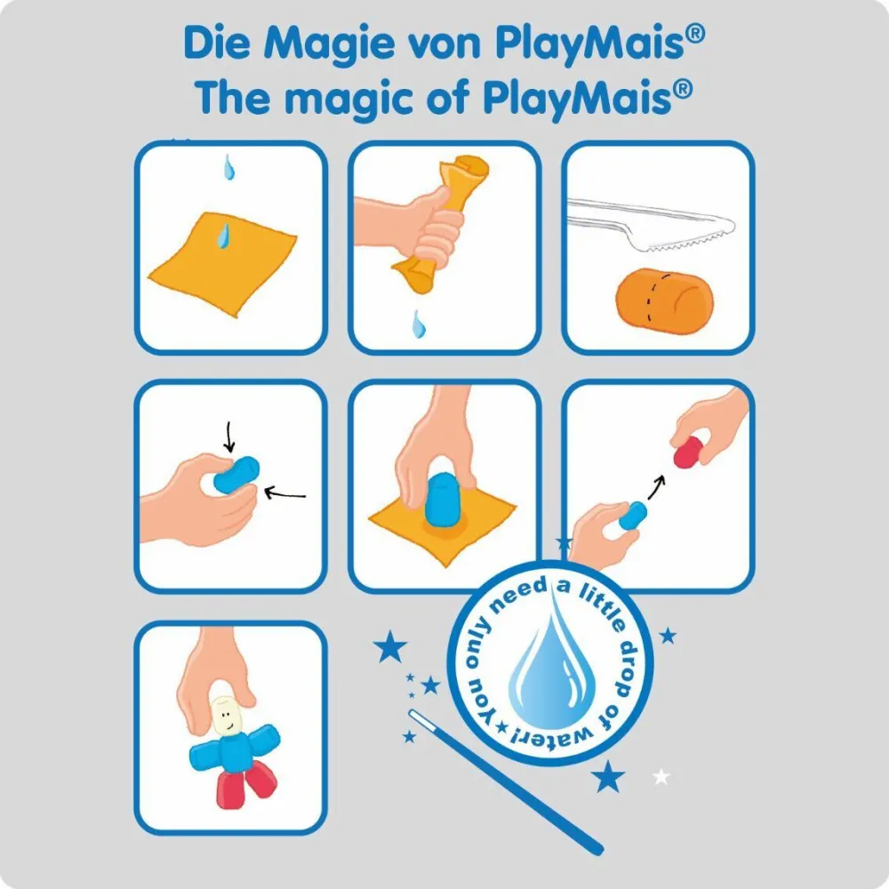 Det er nemt at være kreativ med PlayMais. Dit barn tager en dut op, skærer den over eller maser den i den form, I ønsker, fugter den på en våd svamp og klæber den fast der, hvor I vil have den. Klæbeeffekten opstår, fordi dutterne er lavet af majs, som klistrer, når det bliver vådt. PlayMais er blevet fejret i hele verden og har modtaget mange priser . De er 100% komposterbare, biologisk nedbrydelige, CO2-neutrale og faktisk kan man spise dem.