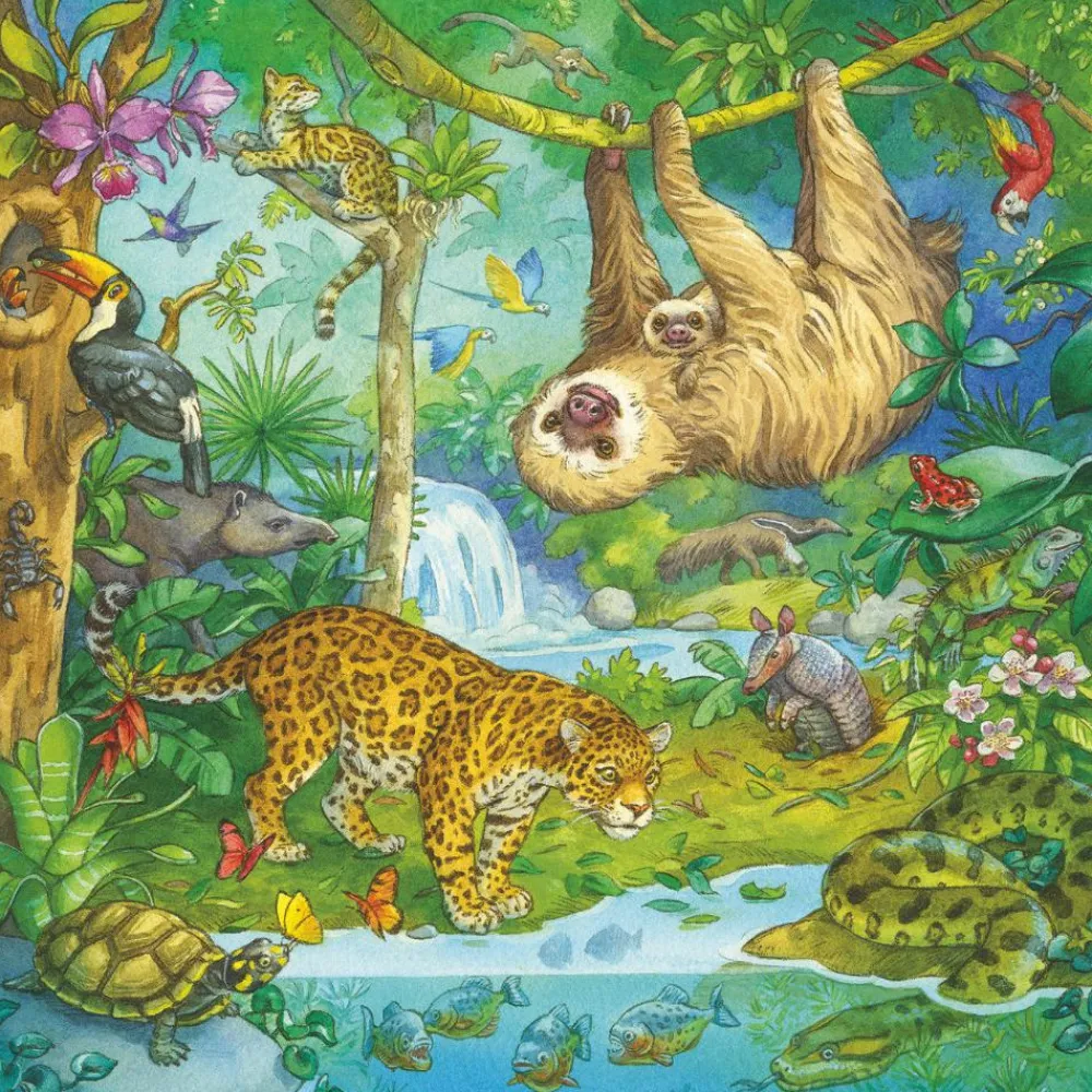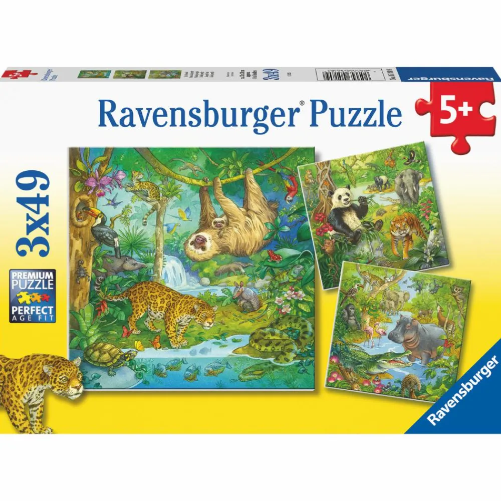 3 puslespil med flotte junglemotiver og 49 brikker. Hvor mange dyr kan I finde når brikkerne har fundet deres rette plads?