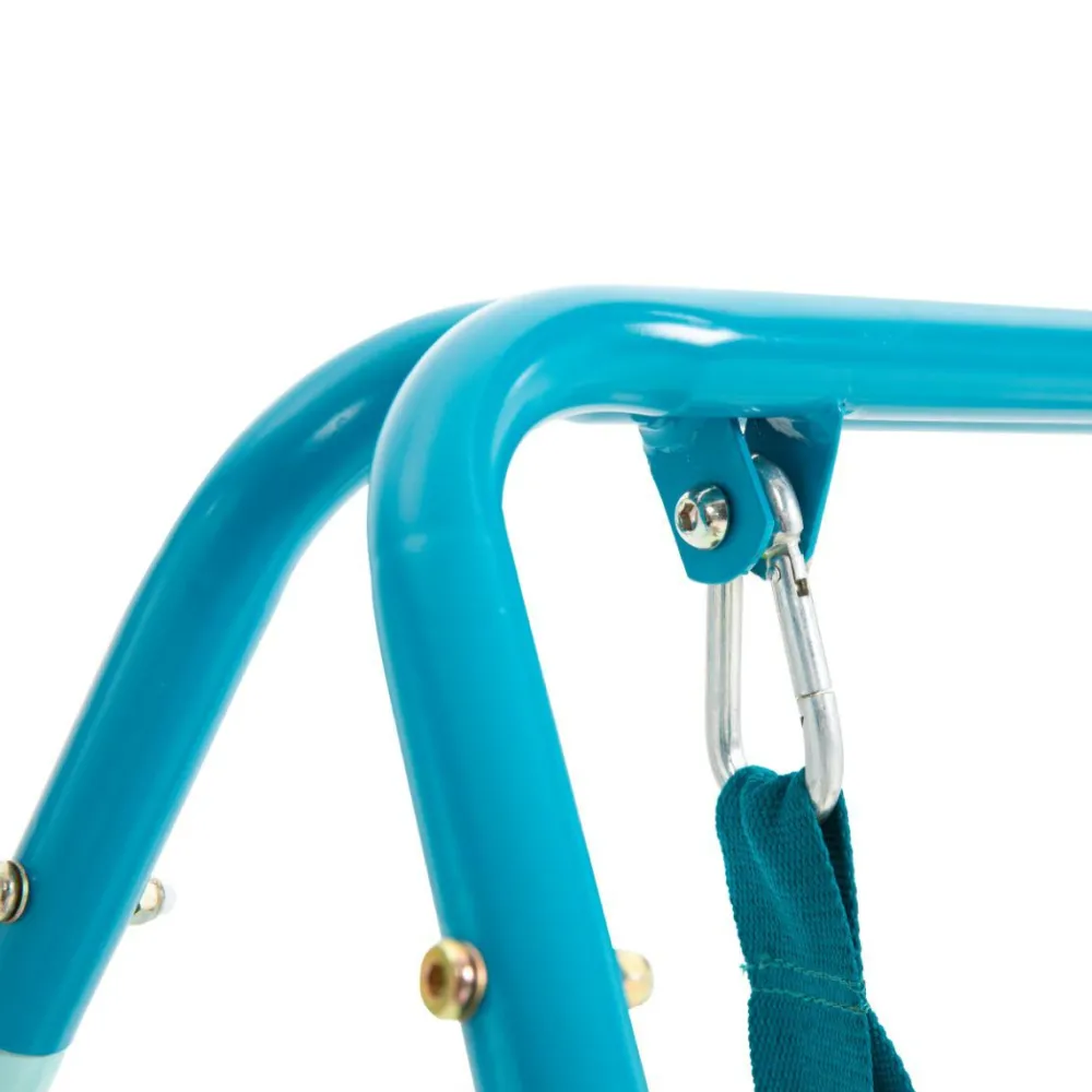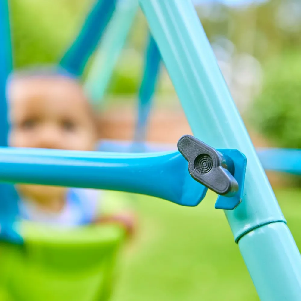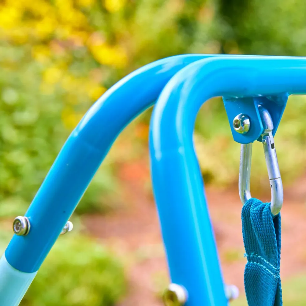 Gyngestativet kan stå ude eller inde, for det er af pulverlakeret og galvaniseret stål. Men hvis du gerne vil forlænge dets levetid, så tag den ind i tørvejr, når vejret ikke er til gyngeture.