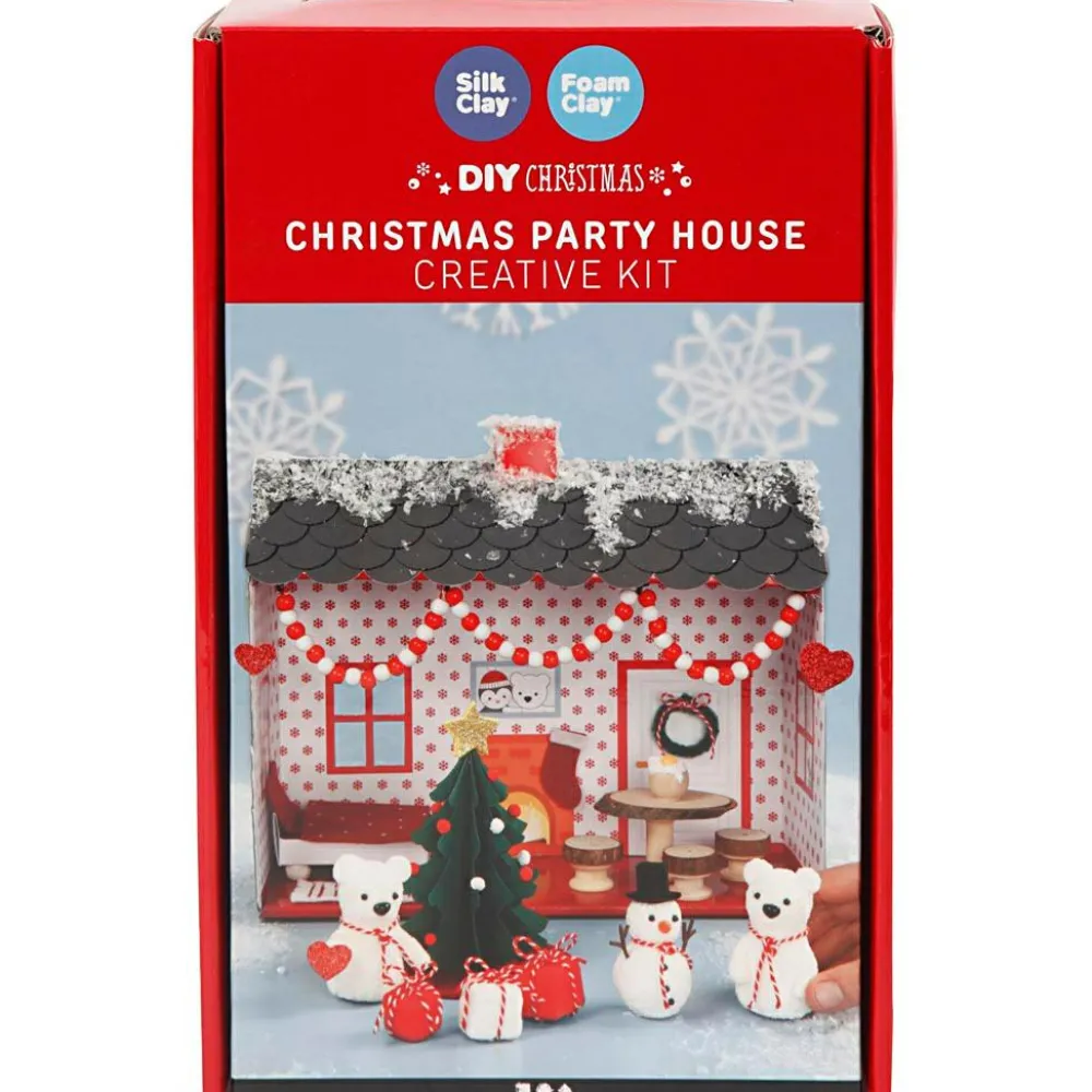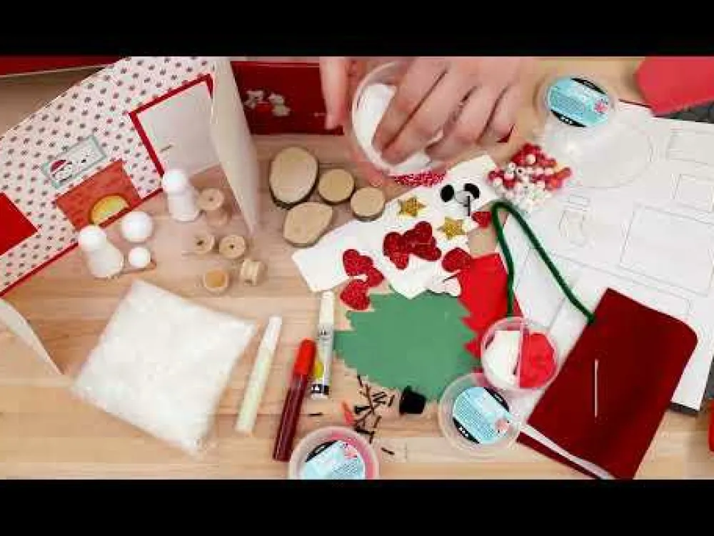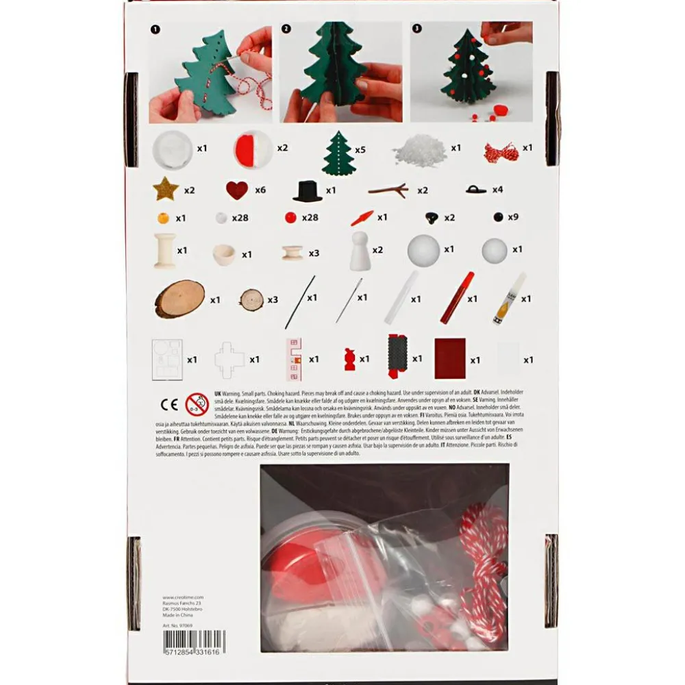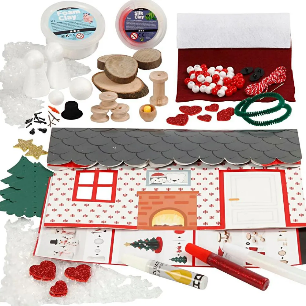Indhold: Foam og Silk Clay i flere farver, styropor, glitterlim, øjne, snuder, filt, snor, perler, dele i træ, sne, piberensere, hjerter, udstansede dele i karton, næser, hatte og arme. Ark til beklædning af æske og tag samt vejledning til montering.