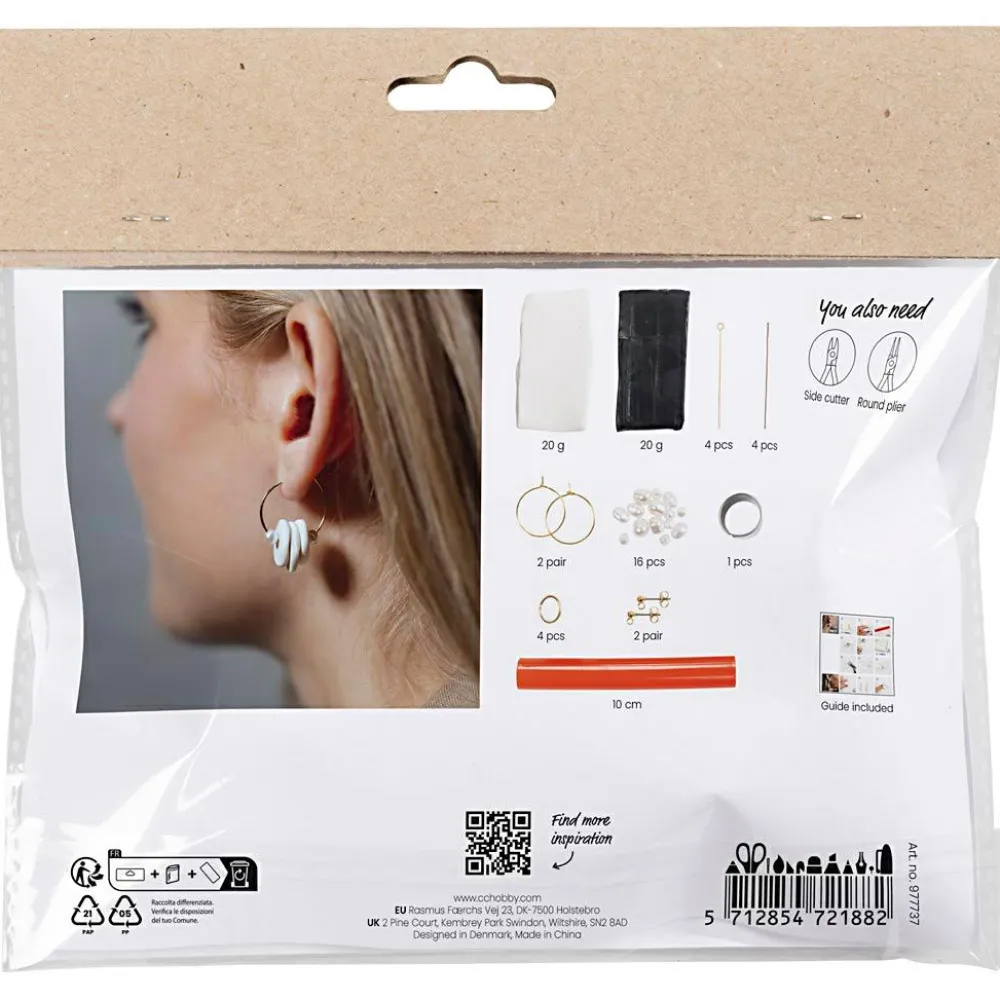 Indhold:Fine clay polymer og voksperler, øreringe, kreoler og andre smykkedele, lerrulle og udstikker. Vejledning følger også med.