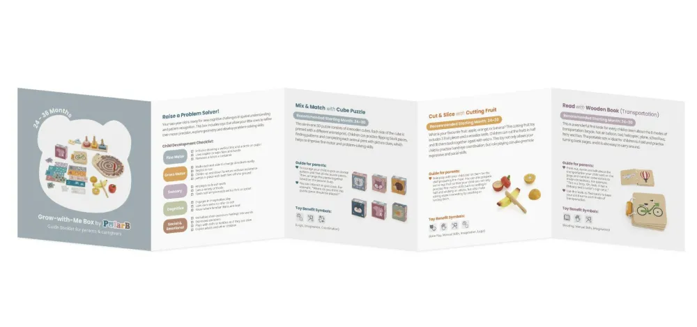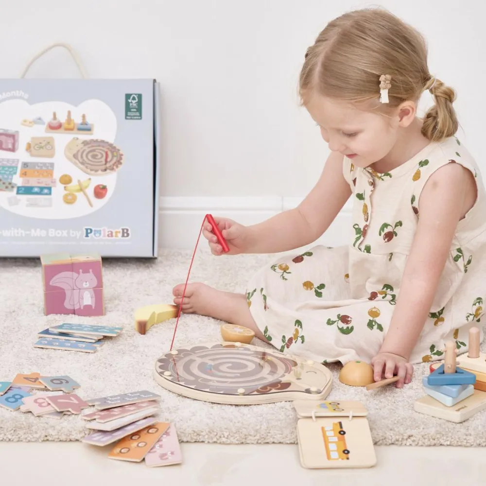 Grow-With-Me boksen er en serie af legetøjskasser med forskellige legeredskaber, der er særligt tilpasset de udviklingstrin, børn i forskellige aldre har. Alt er af FSC-certificeret birketræ og leveres i en æske af pap med træspåner som kassefyld. Der findes Grow-With-Me kasser fra 0-3 år.