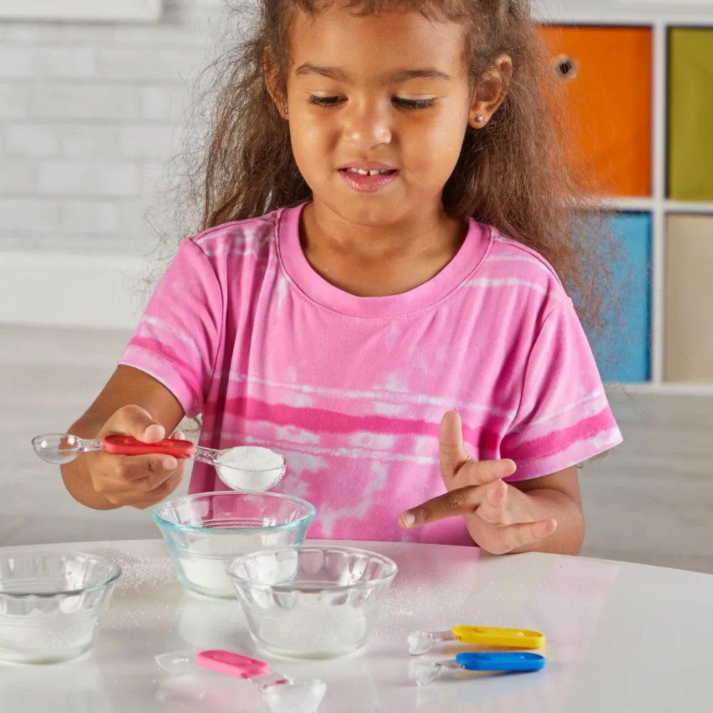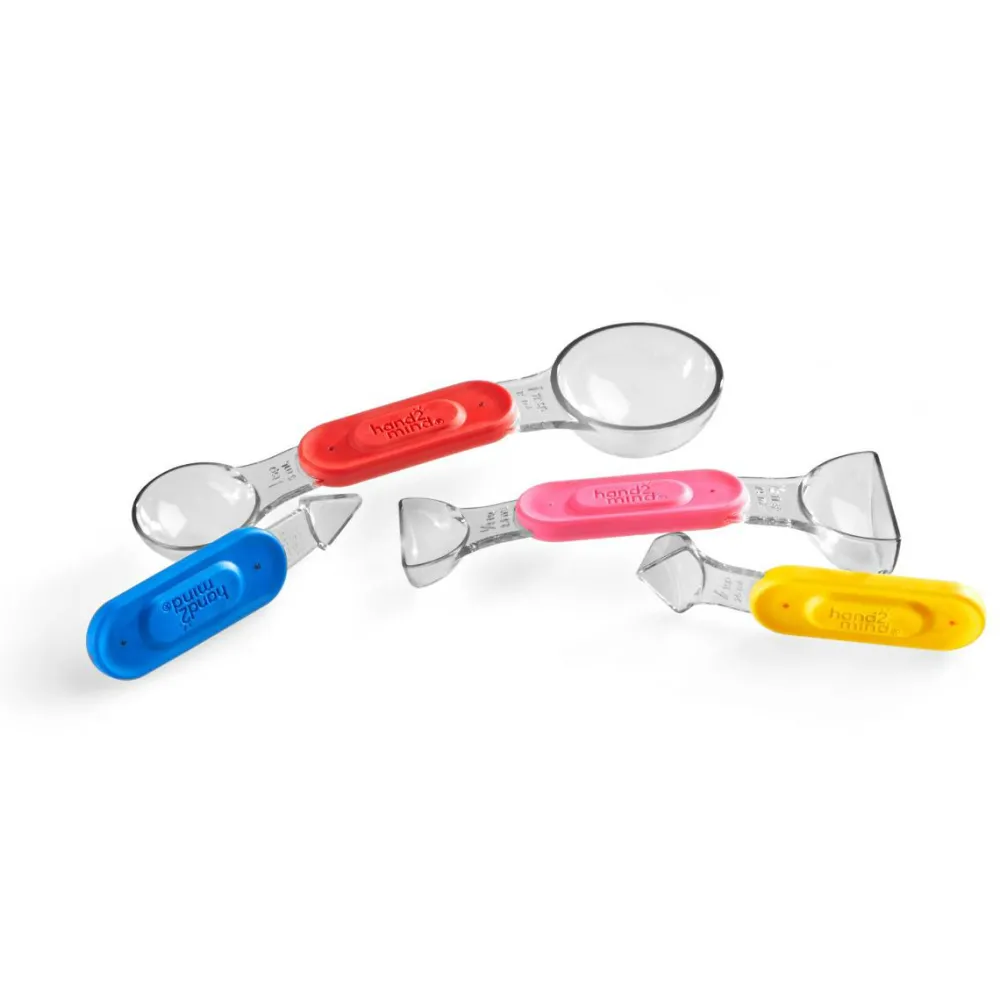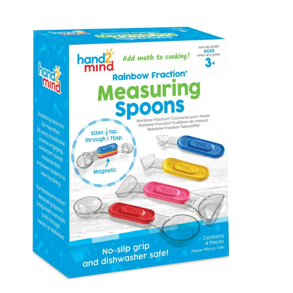 Med disse 4 måleskeer kan dit barn få en hands-on fornemmelse af brøker og hvor stor mængdeforskel, der eksempelvis er på 1/4 og en halv teske.