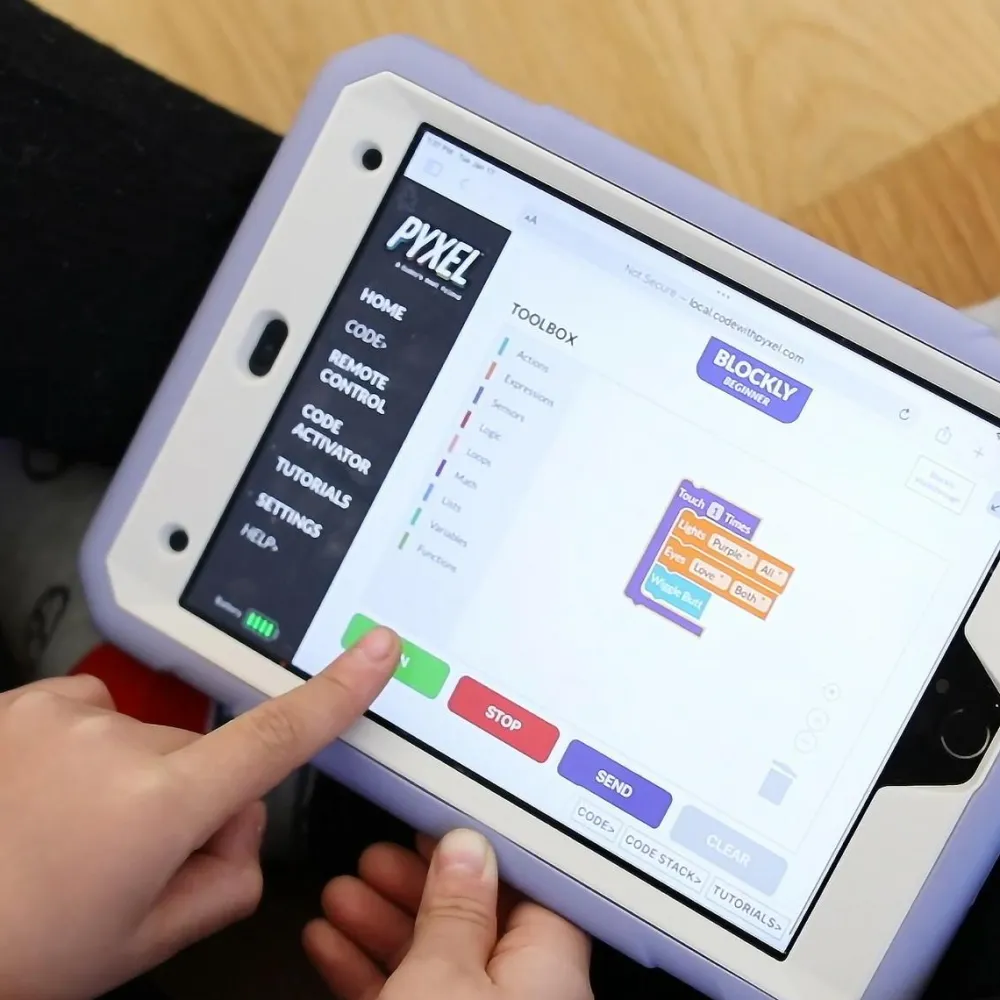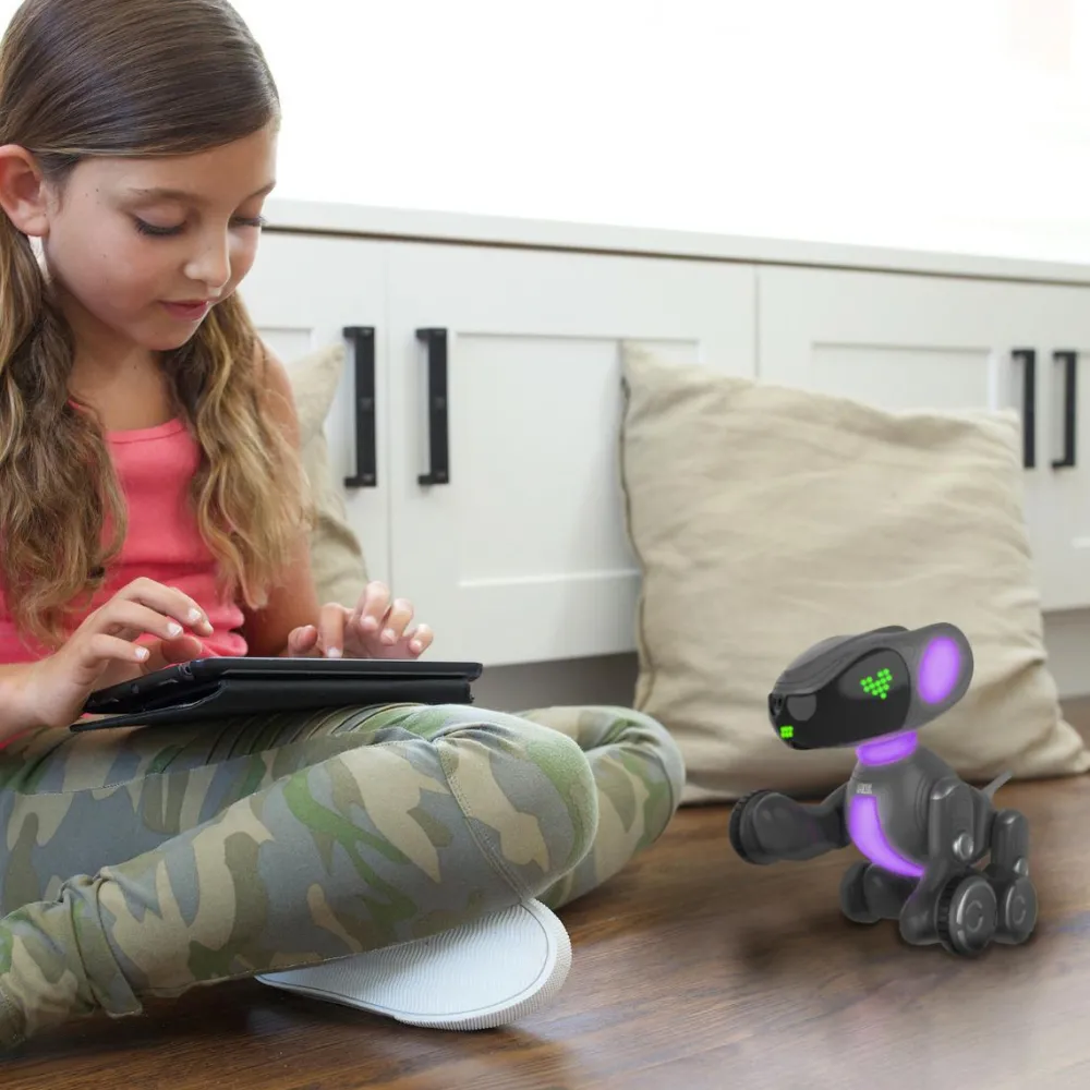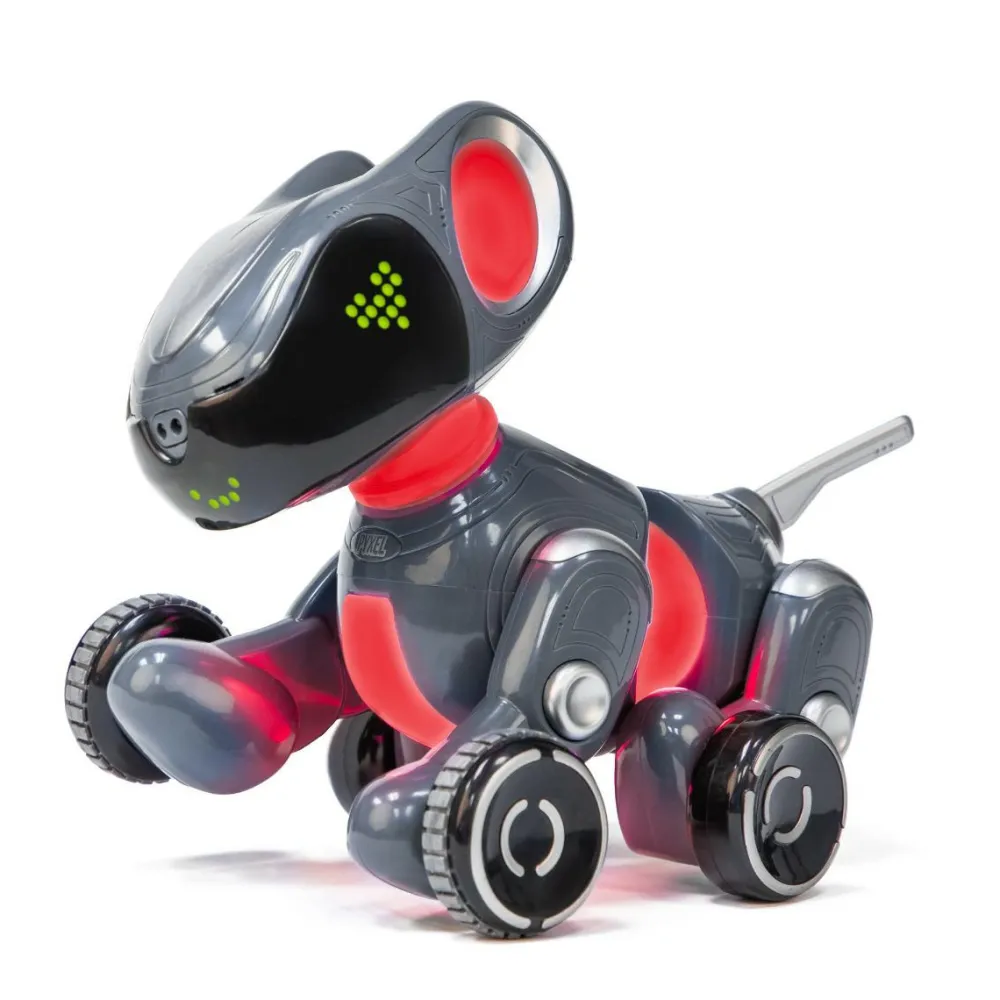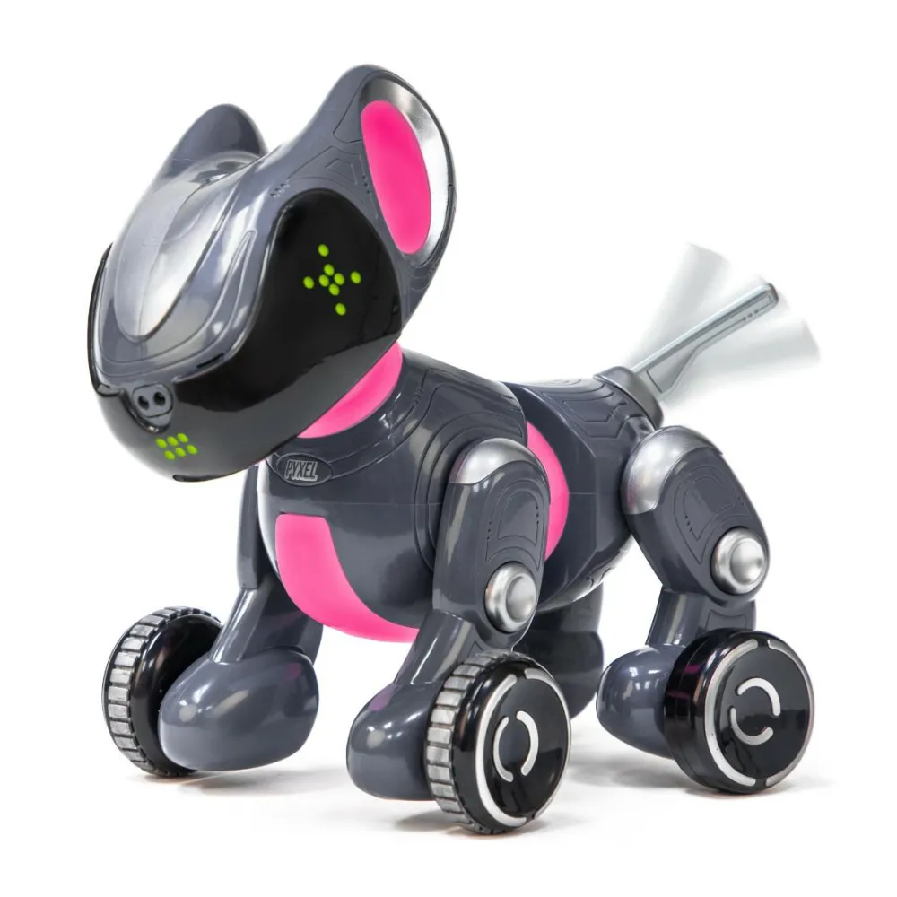 Den søde, logrende Pyxel er en introduktion til at kode med blokke. Det betyder, at dit barn åbner en app, som kan styre robothunden, og her kan dit barn give Pyxel den ene kommando efter den anden. Dit barn bygger en række af kommando-klodser, hvor der fx kan stå “gå fremad”, “logre”, “spinne” “kærlige øjne”, “stå”, “tisse” og så videre, og kommandoerne kan bygges ind i hinanden som puslespilsbrikker.
