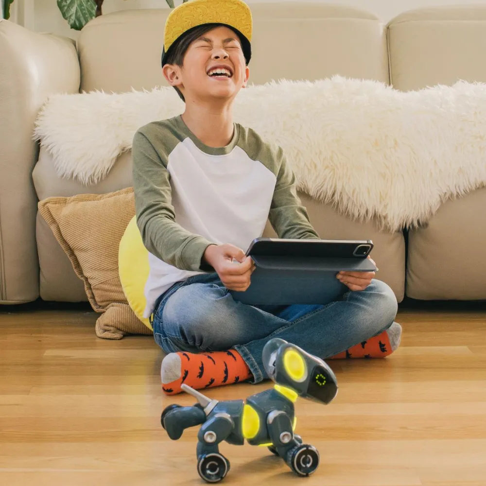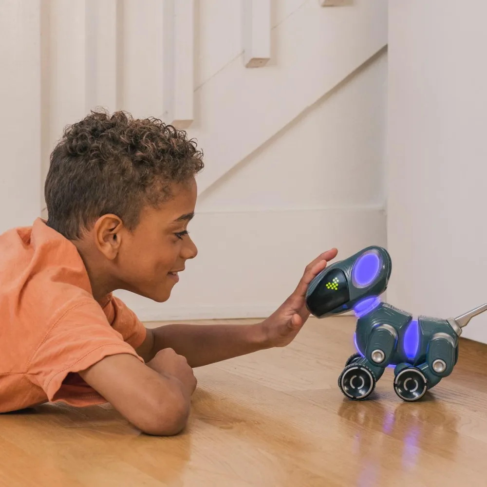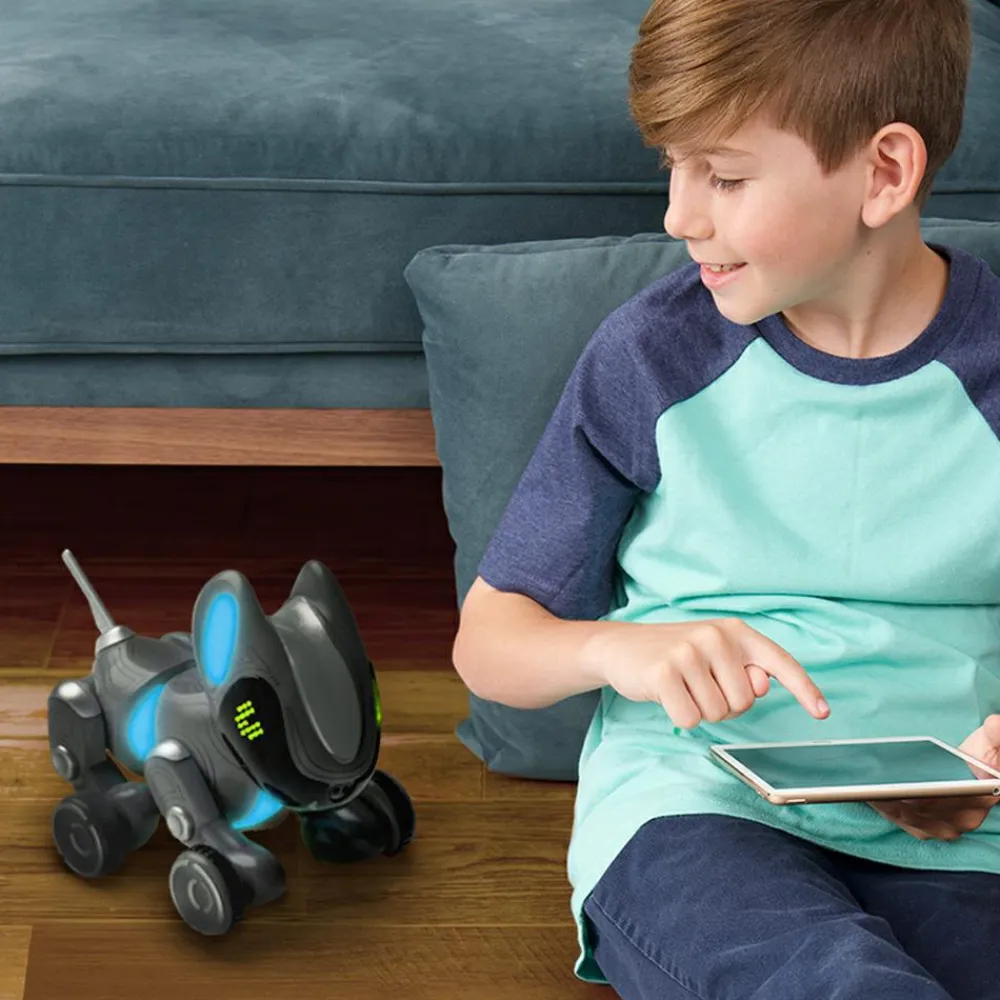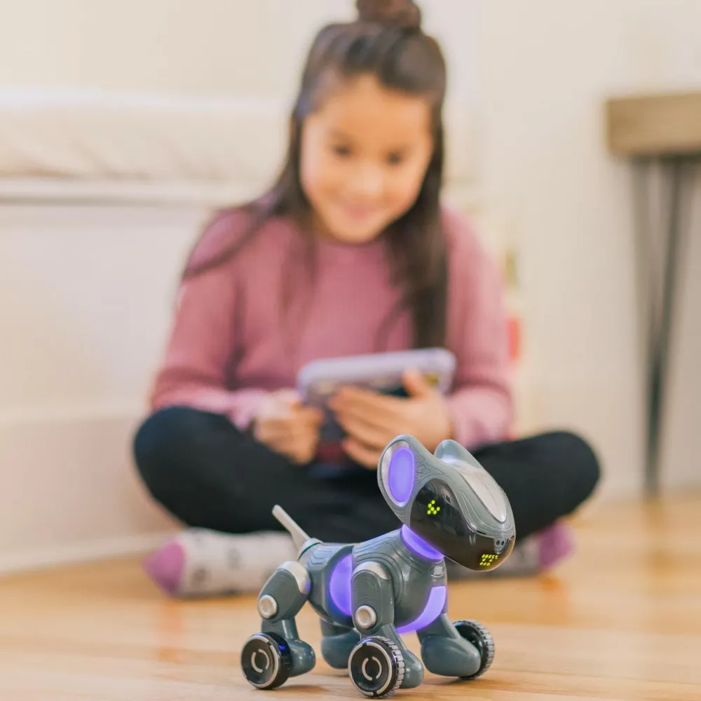 Den søde, logrende Pyxel er en introduktion til at kode med blokke. Det betyder, at dit barn åbner en app, som kan styre robothunden, og her kan dit barn give Pyxel den ene kommando efter den anden. Dit barn bygger en række af kommando-klodser, hvor der fx kan stå “gå fremad”, “logre”, “spinne” “kærlige øjne”, “stå”, “tisse” og så videre, og kommandoerne kan bygges ind i hinanden som puslespilsbrikker.