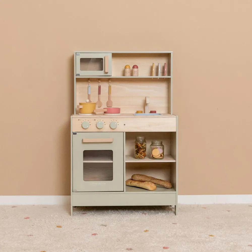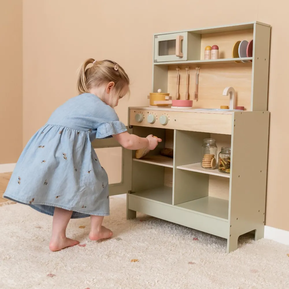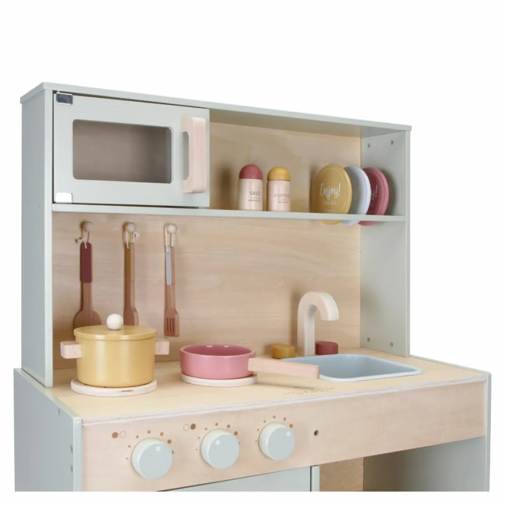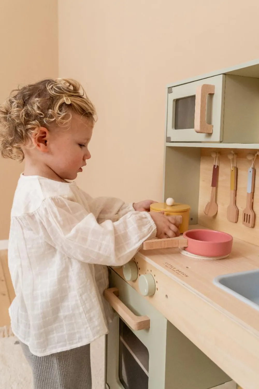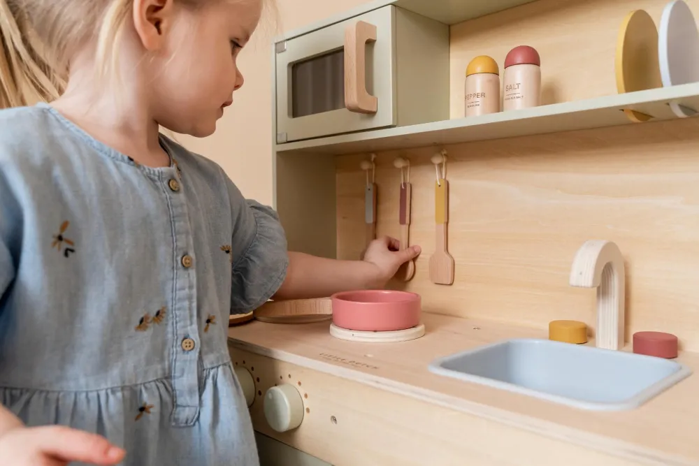 Her får du køkkengrej med i købet, når du køber det fine legekøkken. Det gør bare legen sjovere, at der er gryde og pande og noget at røre mad. Køb også gerne lidt legemad med, hvis I ikke har i forvejen. Så kan rollelegen begynde.