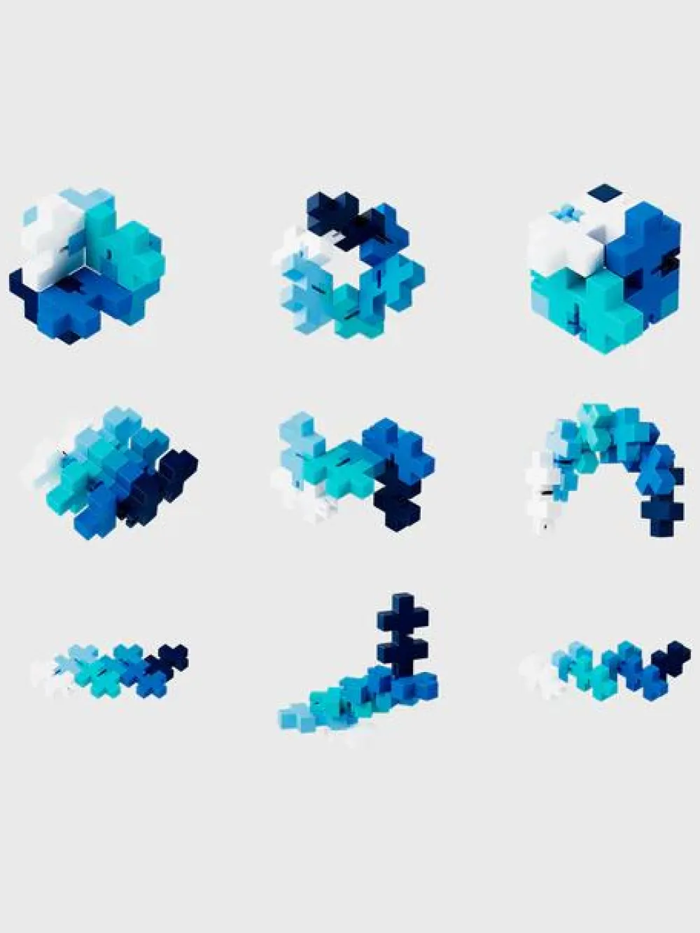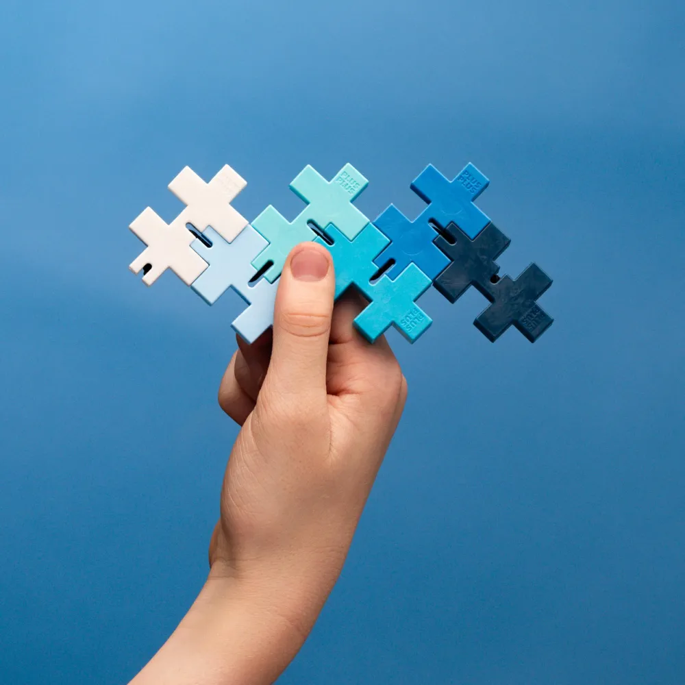 Plus-Plus møder fidget toys. Brikkerne sidder sammen med elastiksnor, som giver mulighed for at rykke rundt på brikkerne og sætte dem sammen på forskellige måder. Fx som en cirkel, firkant eller bue eller som en bugtet slange.