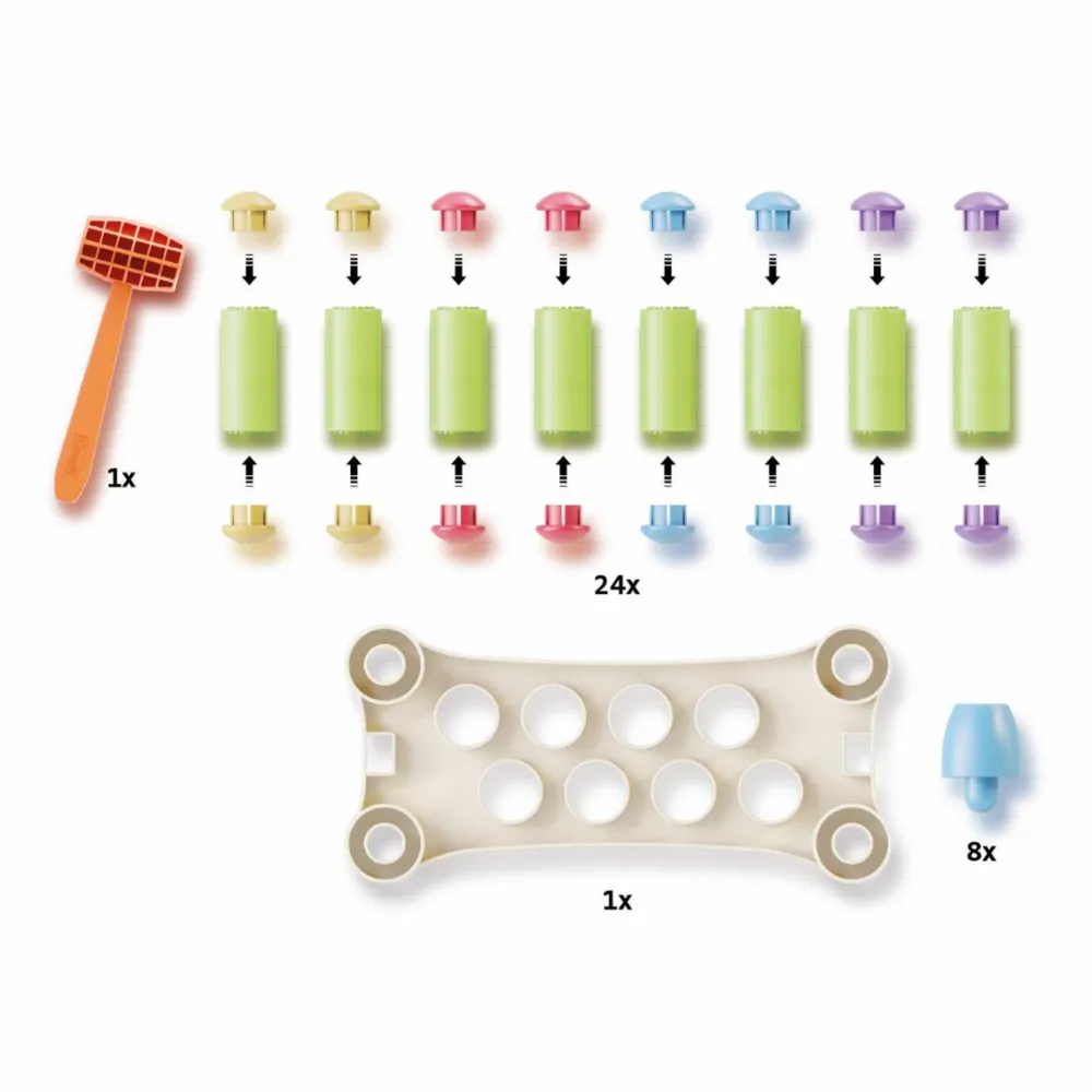 Flot hammebræt med pastelfarvede pløkker, som er herlige at hamre ned i brættet. Når det er gjort, er brættet lige til at vende, så legen kan starte forfra.