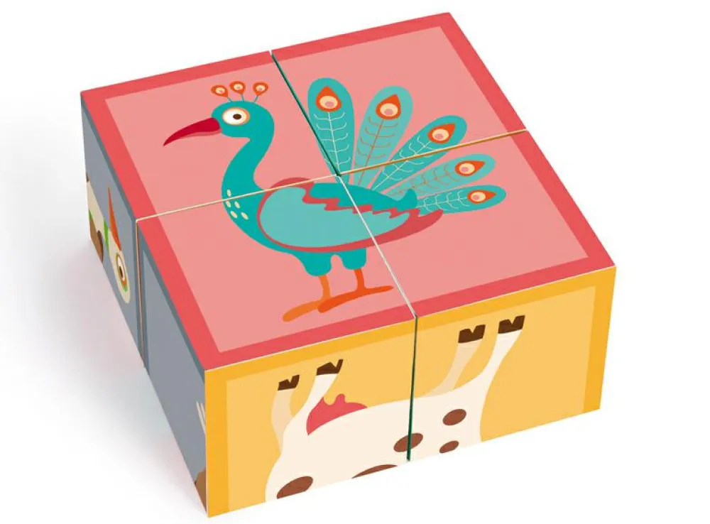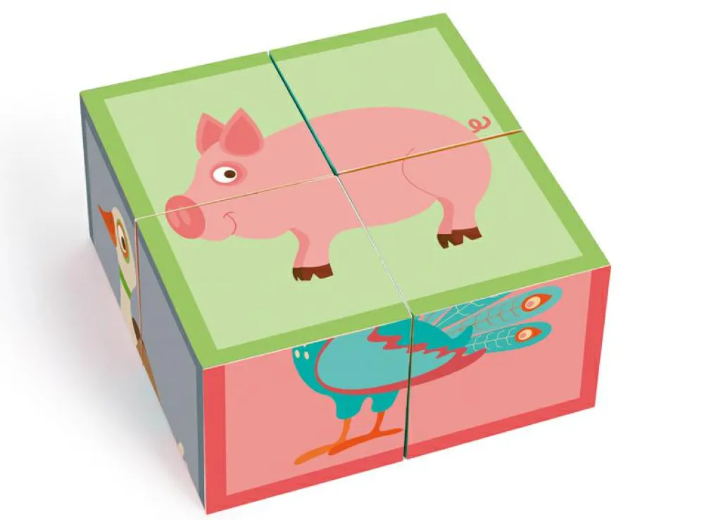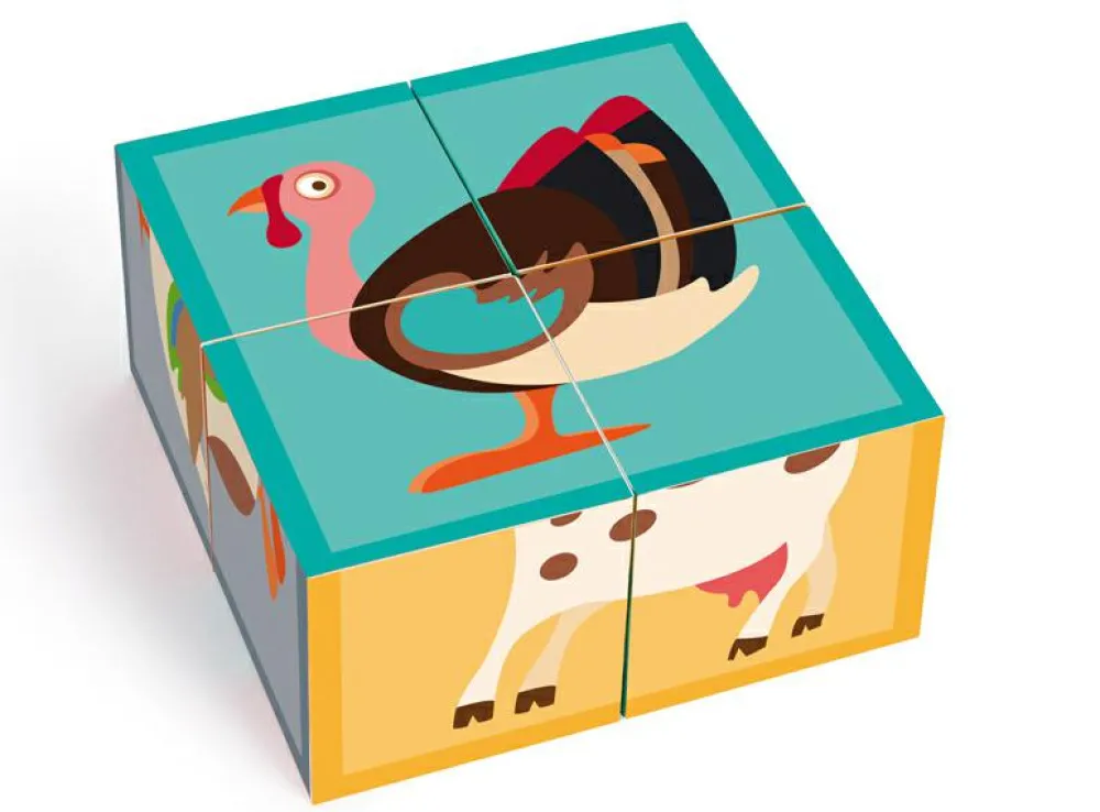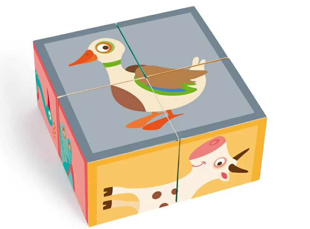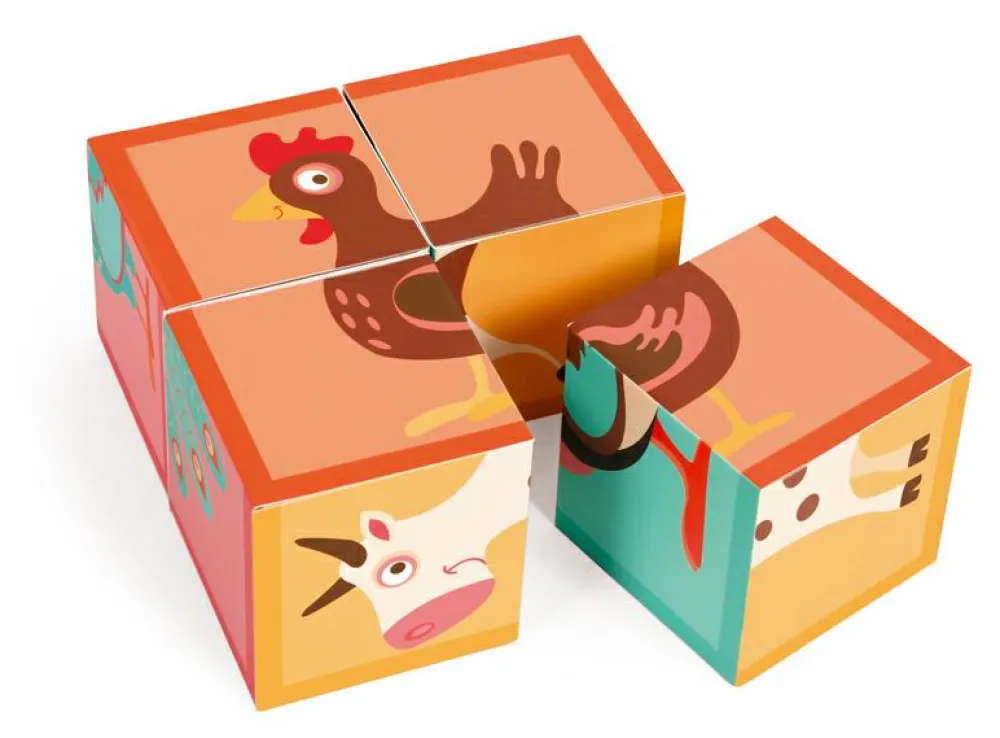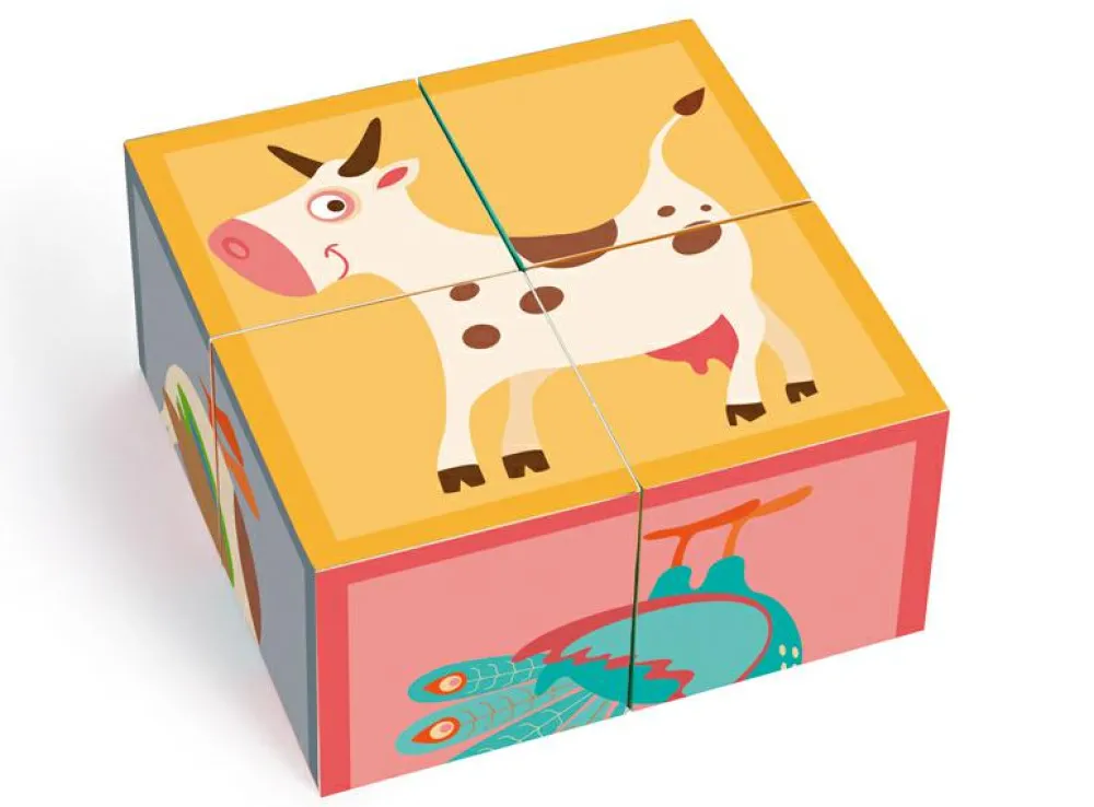 Fint puslespil af den type, der består af 4 firkantede klodser, som kan vendes og drejes, indtil der dannes et samlet motiv på den side, der vender opad.