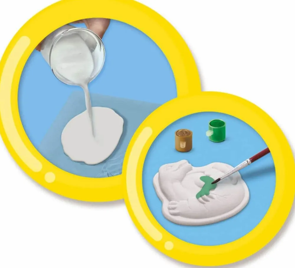 Med dette kreative sæt, kan dit barn støbe og dernæst male de forskellige dinosaurer, der er klækket, ved hjælp af den medfølgende gipsblanding og afstøbningsformene, som er i genanvendt plast.