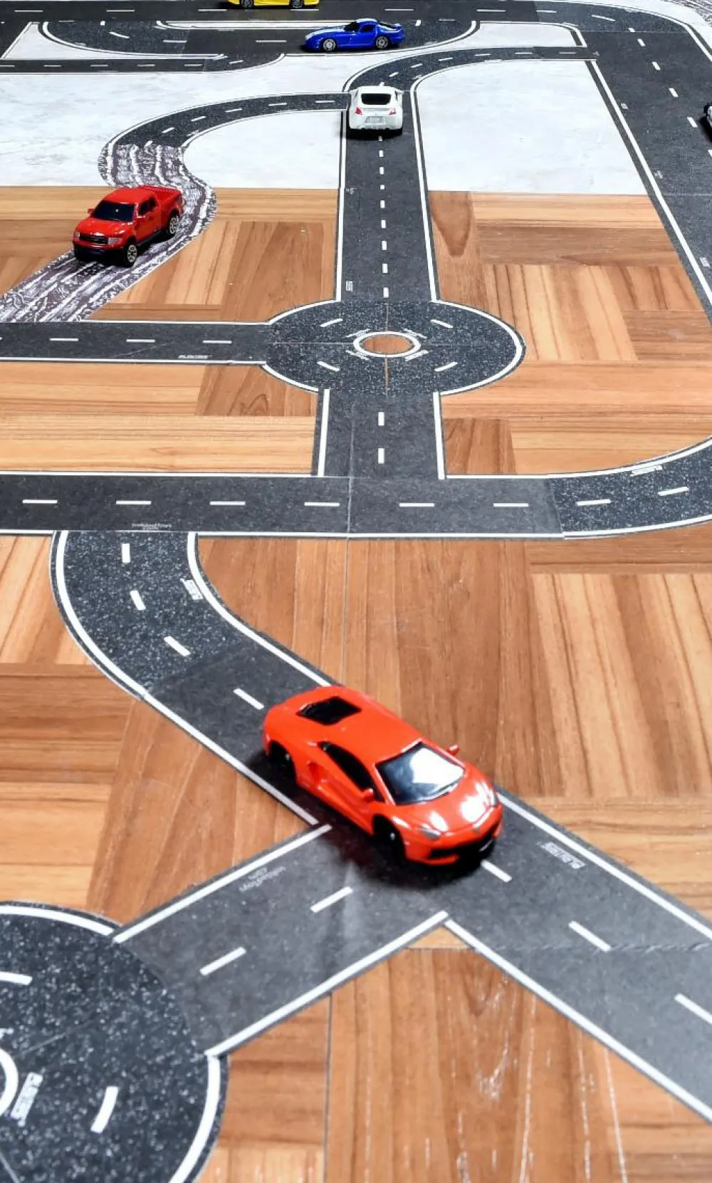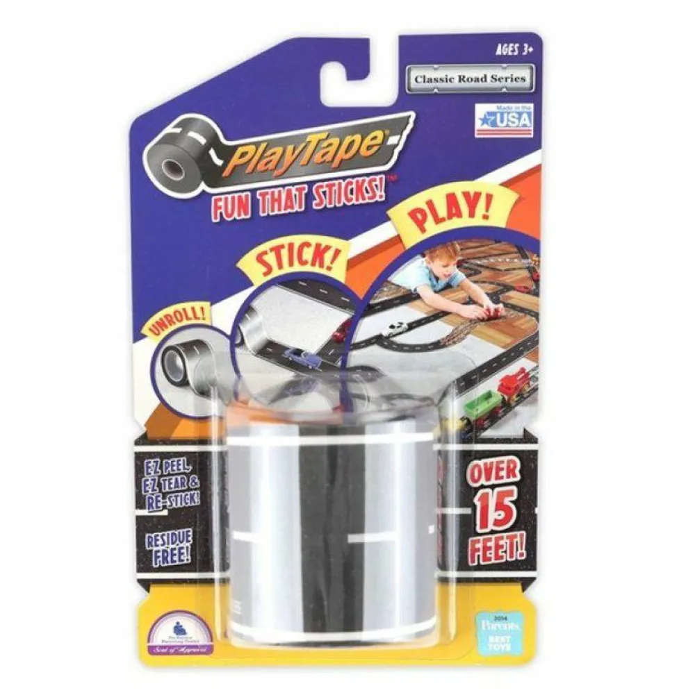 Enhver plan overflade kan trylles om til 5 m bilbane med Playtape. Det kan nemt tages af igen og er genanvendelig, og den efterlader ingen spor. Hvor smart er det lige?