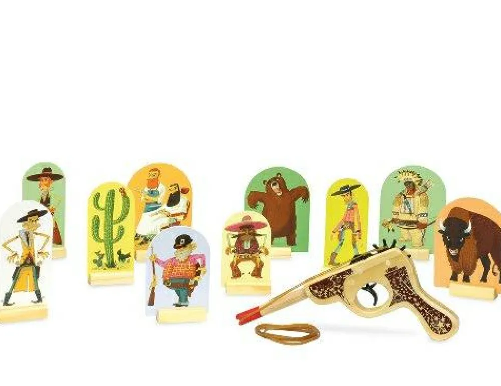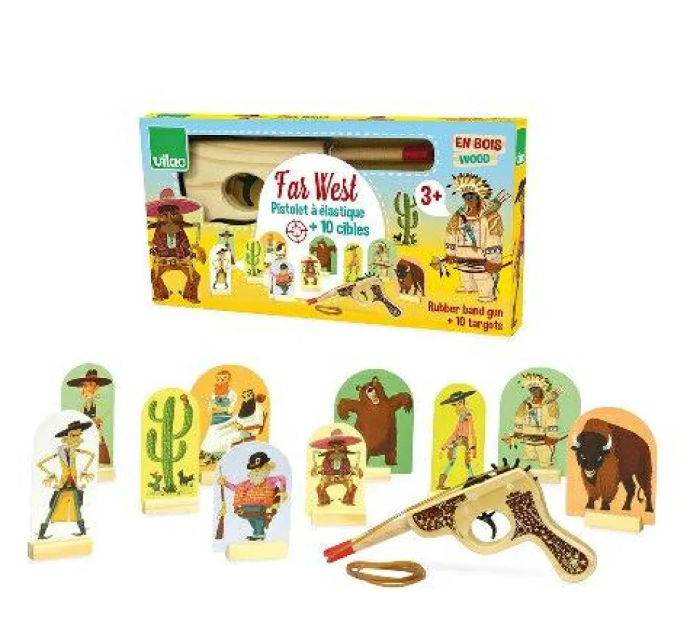 En pistol, som skyder med elastikker. Nem at lade, selv for små fingre. I stedet for kedelige skydeskiver, kan dit barn skyde til måls efter sjove figurer i træ. Der er både en kaktus, indianer, bison og meget mere – taget lige ud af en klassisk Western.