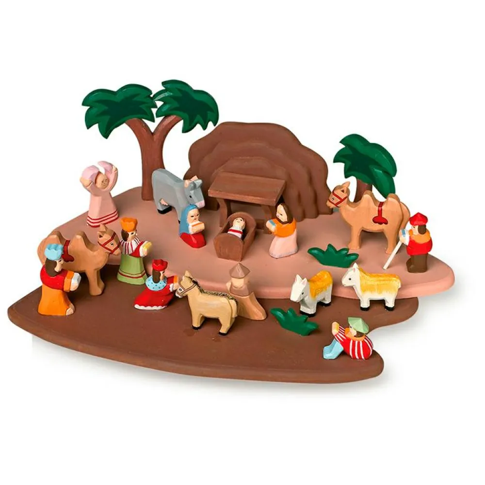 Figurerne er bl.a. Josef, Maria, det lille Jesusbarn, de tre vise mænd, hyrder, dyr i stalden, en engel og kameler, der er klar til fortælling af historier fra Biblen eller andre fortællinger.
