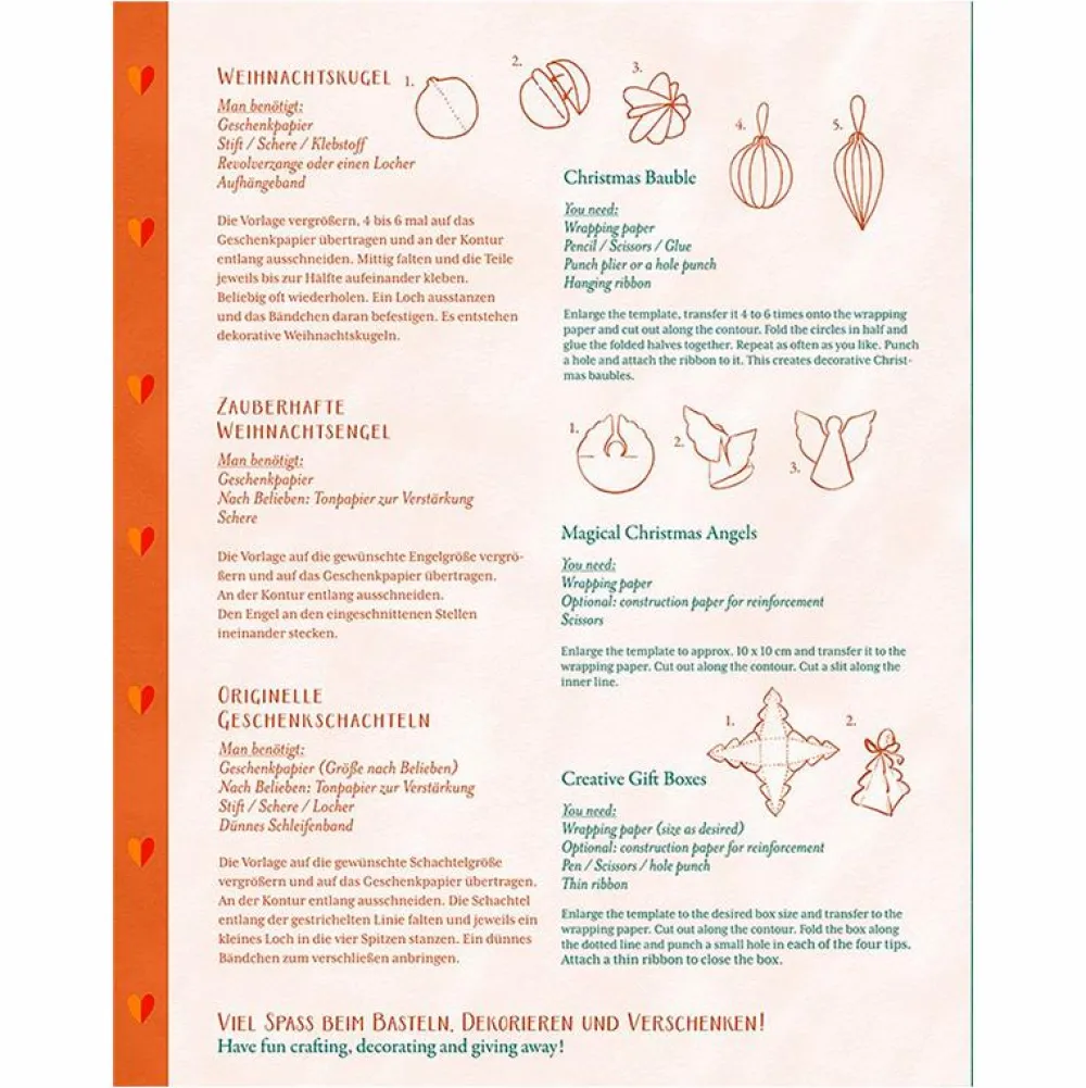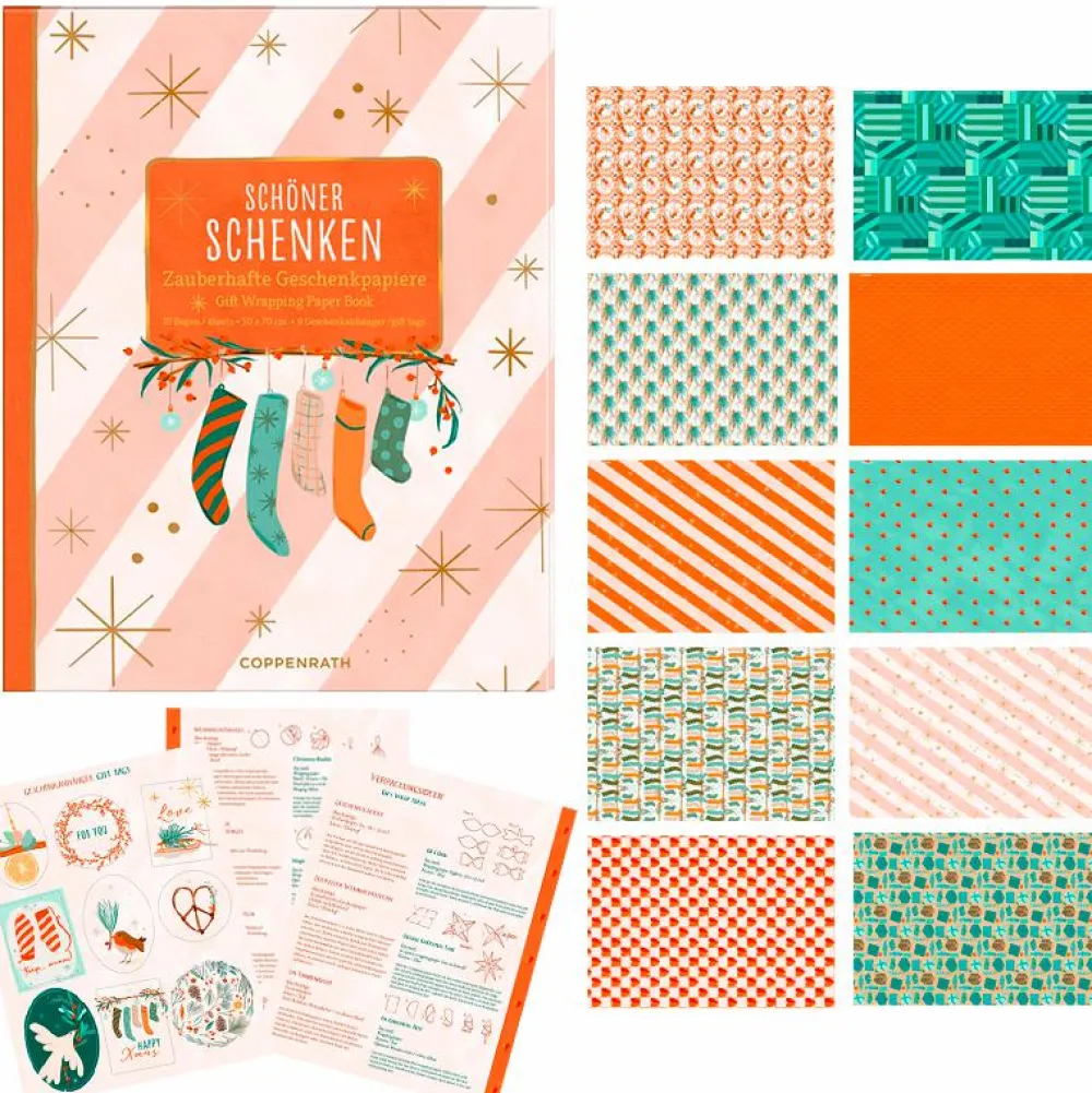 Her er 10 ark på 50 x 70 cm tykt og smukt designet gavepapir med fine tryk samlet i en bog med tilhørende til-og-fra-mærker.