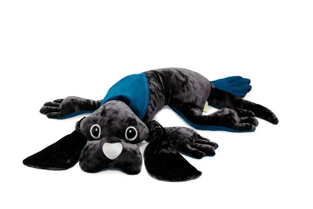Blød velourhund som er dygtig til at ligge stille på skødet så længe det skal være. Denne tyngdebamse kan for eksempel ligge på dit barns skød, mens der læses højt fra en god bog.