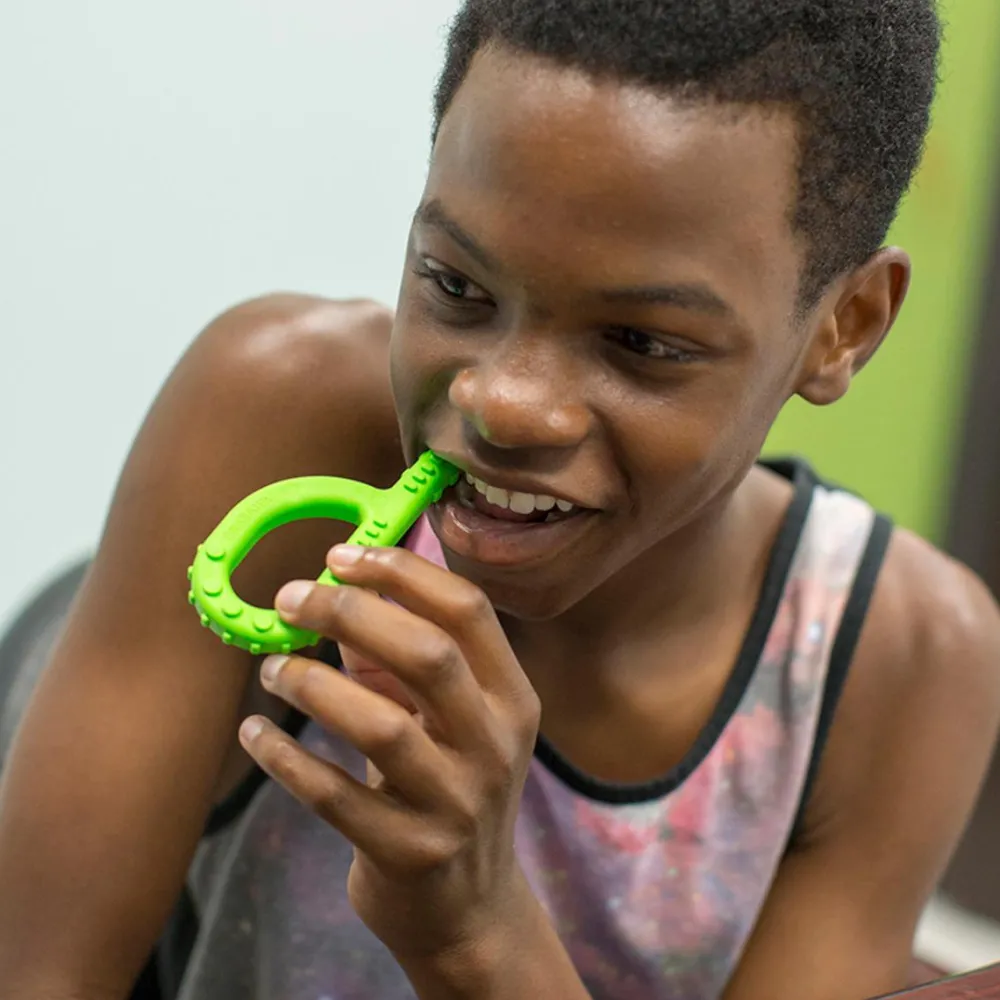 Sensoriske tyggeredskaber er en fællesbetegnelse for tyggesmykker, tyggelegetøj og bidehalskæder og vibrerende redskaber til børn, der har et så stærkt behov for at tygge og gumle, at der skal særlige redskaber til. Nogle børn sutter, tygger og gumler for at berolige nervesystemet via de mange såkaldte receptorer i tandrødderne og i mundhulen. Der er ikke fare forbundet med tyggetrang, men hvis du gerne vil skåne blyanter, bluseærmer og puder, så er et sensorisk tyggeredskab en god ide. Vores tyggeredskaber er sikre at anvende og hygiejniske.